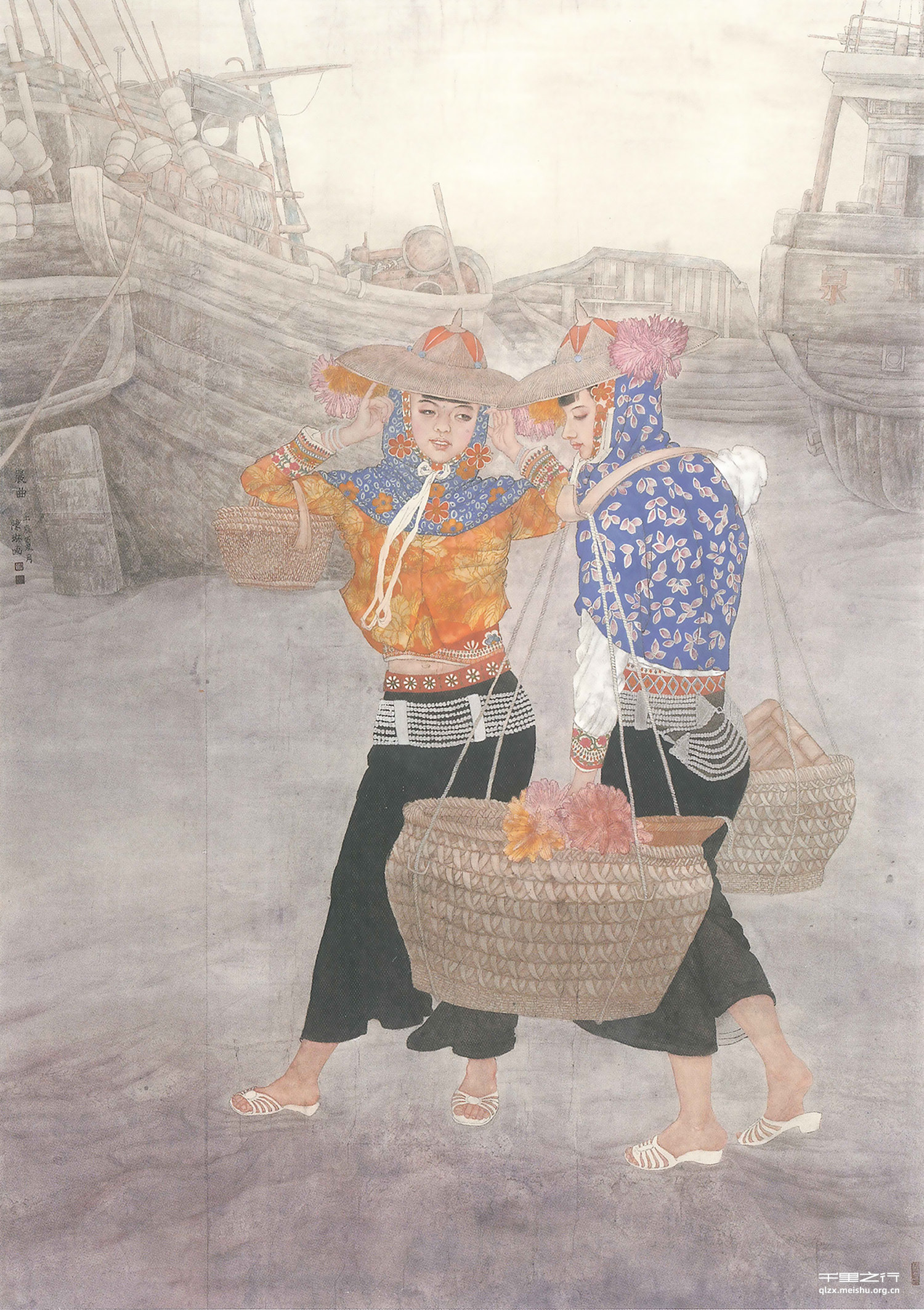 这幅作品是想展现勤劳的惠安女早出晚归劳作的辛苦和她们散发出来的善良与智慧,以及对美好生活的向往与追求。该画所表现的是天还蒙蒙亮的时候海边沙滩上就已经有两名年轻美丽的惠安女扛着扁担,提着箩筐去劳作了,虽然劳动是辛苦的,但是从她们微笑的表情和幸福的姿态可以看出她们对生活积极向上的态度。