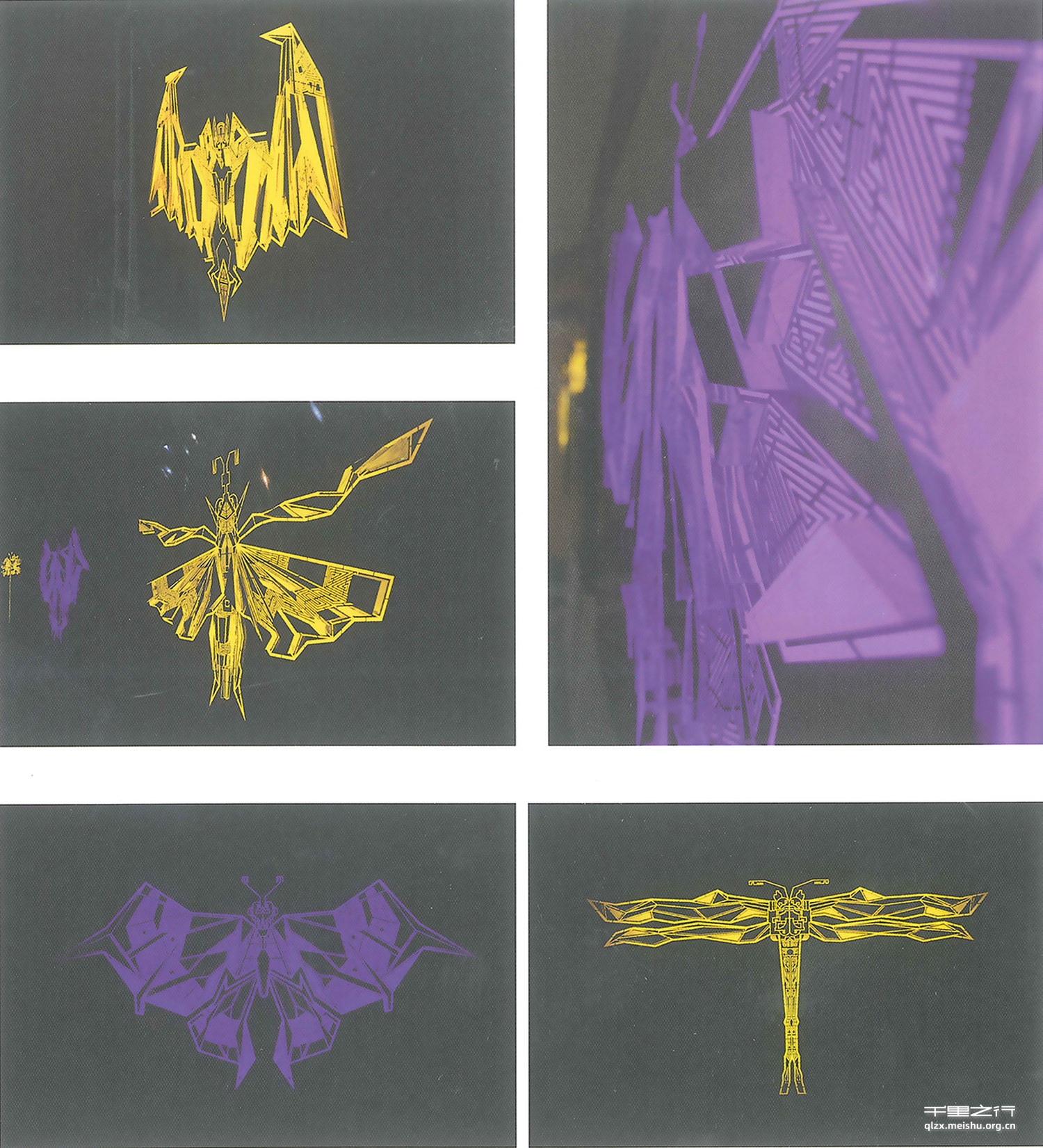 该壁挂作品的创作灵感来源于一组带翅膀的动物及昆虫,利用夸张和机械变形的设计手法将蝙蝠、蝴蝶、蜻蜓、蝗虫和瓢虫的形象平面化,并根据它们双翅的造型和纹样的特点突出了"对称性"给该组作品带来的视觉力量。该作品选用了不锈钢激光镂空的制作工艺,选用透光度好的彩色亚克力作为背板,并在整体平面上镶嵌了适合于图形的亚克力块,不仅使其在光线下富有变化,还增加了作品的层次感。