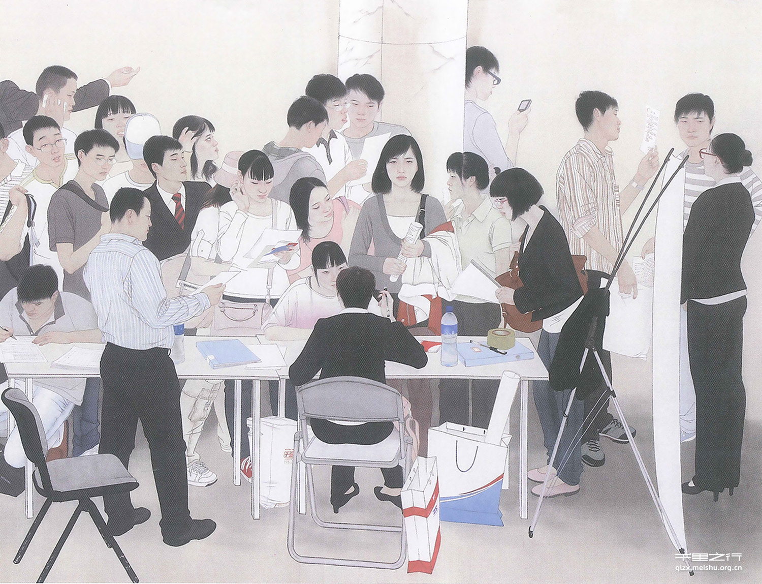 在当下,毕业即失业,就业的压力是笼罩在每个毕业生心头的一块石头。我的作品刻画的就是在招聘会现场的一群大学生。形形色色的大学生,或焦虑或迷茫或皱眉或思考,有的在打手机、有的在发短信、有的在看招聘简章、也有满头大汗喝水的等等。这群人只是一个缩影。他们的去向在哪里呢?就在自己手上。我相信,只要努力,总有属于自己的位置。