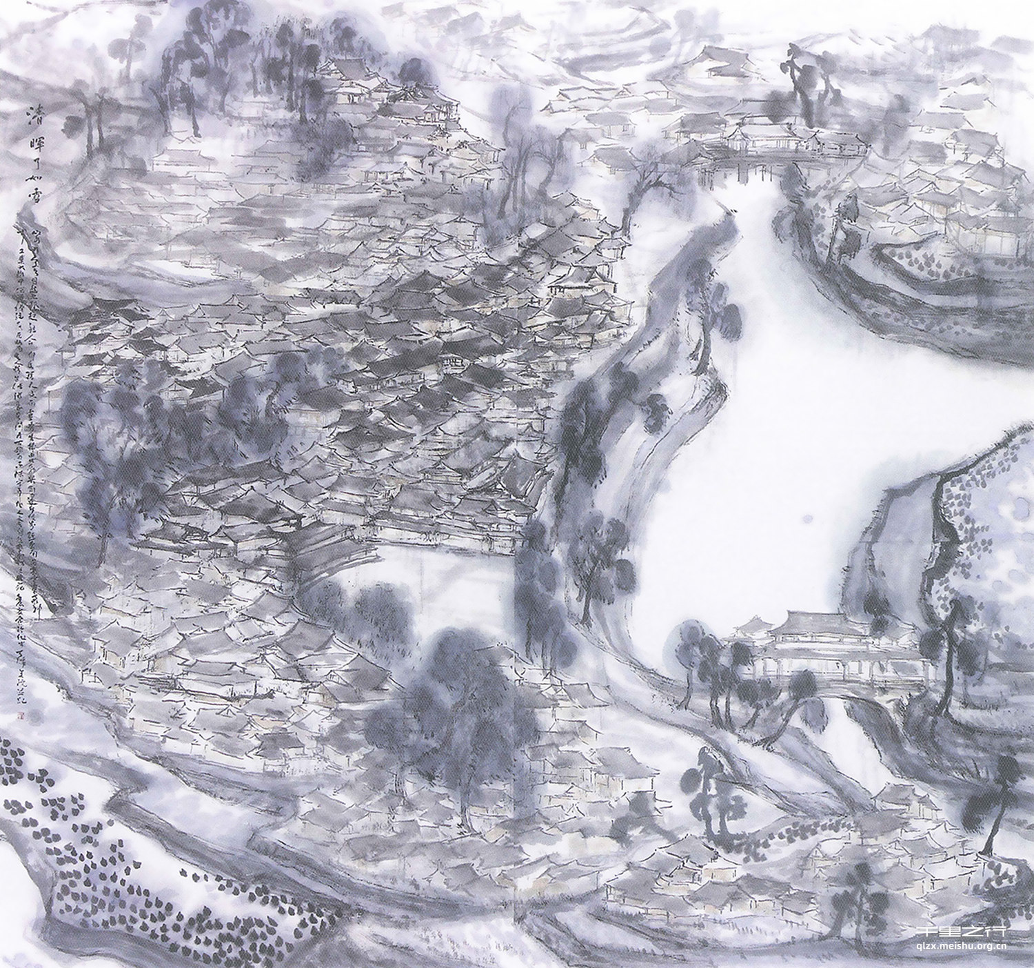 于创作中寻找自己的语言以抒内心与自然交融之感是我在创作中竭力之所求。此幅作品,题材取自贵州西江古镇,此地民风纯朴,工业化痕迹甚少,且其生活多沿承旧习,房屋多木质结构,环山依势层层建造,屋宇交错之状甚奇!甚妙!人与自然和谐至极,仿若桃源一般。于此地景致人文可窥古风之一斑;画之情境乃受启于朝阳将升而露气未退时宁静清凉之感;为得其古韵且不落旧气之窠,在画面布局安排上多做平面化处理,以求既得古之风韵亦含今之新意。