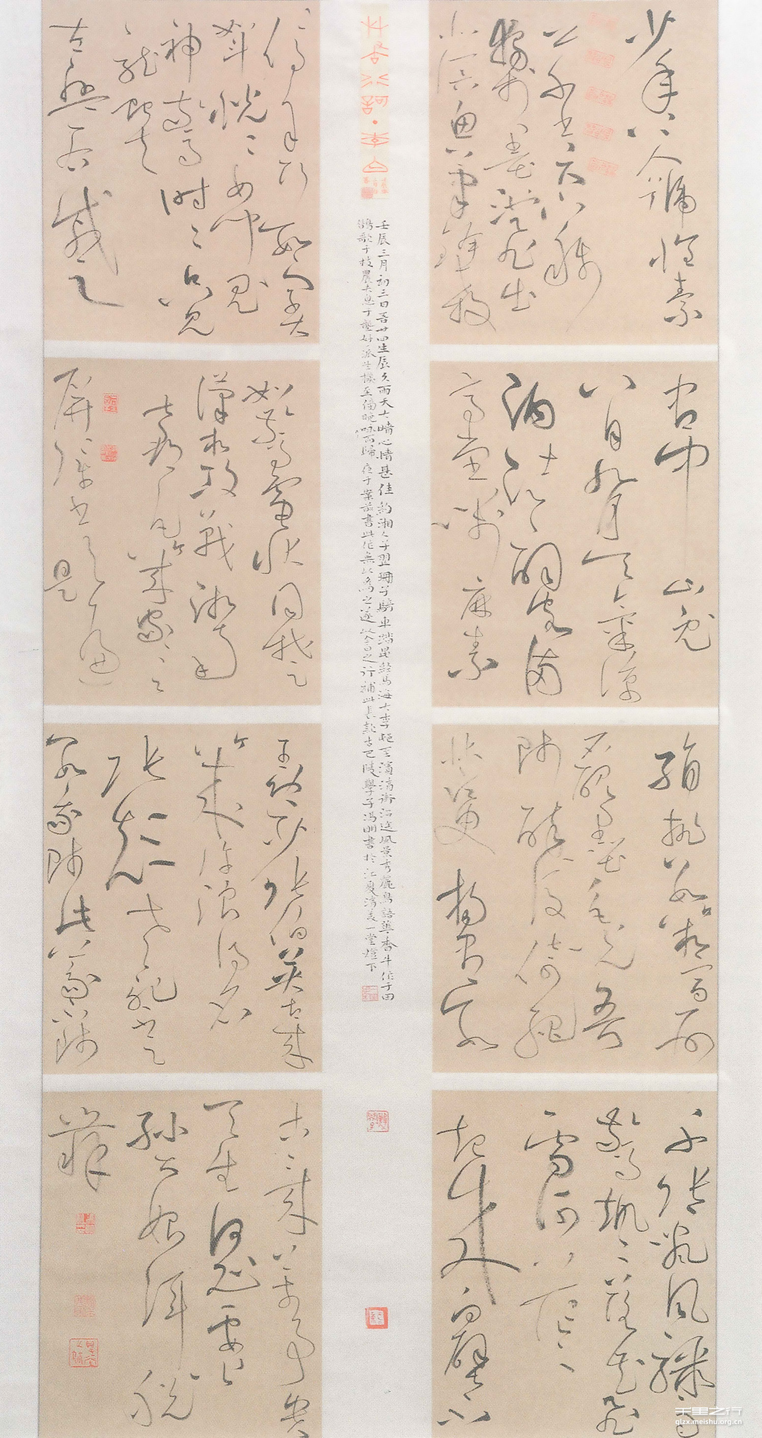 此件作品以怀素《自叙帖》为基调,追求每一块面的空间与造型,使其即不同又能相协调,从而表达草书酣畅淋漓的个性情感。