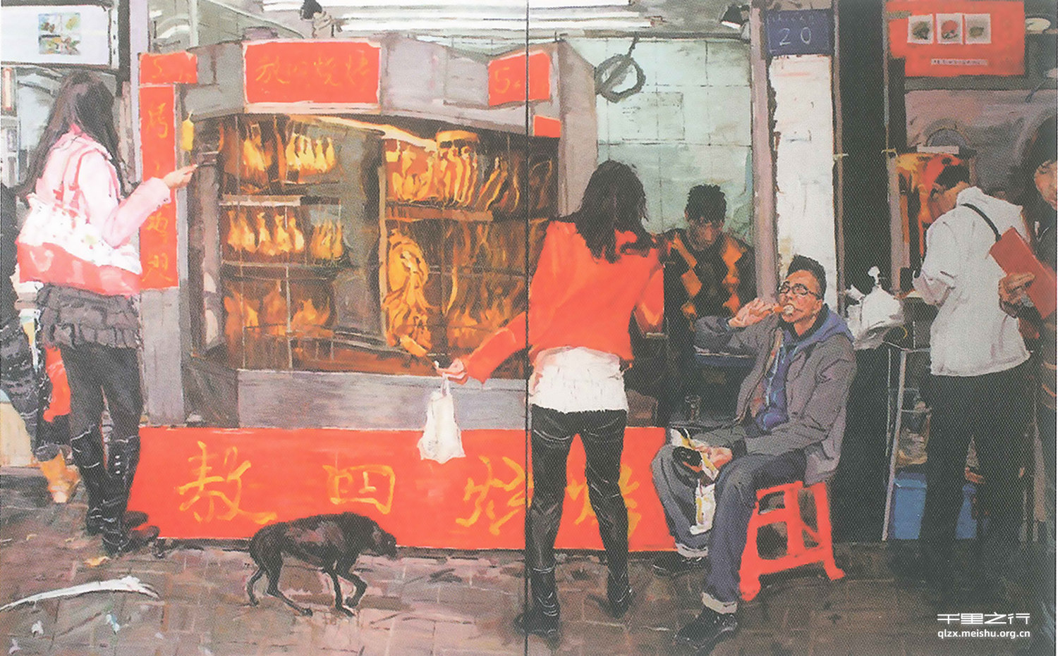 作品记录了江滩步行街附近的一个小胡同里的生活场景,一个偶然的瞬间,我感受到市井文化对比城市进化的过程有一种被遗忘的失落感,与我即将毕业巧无去无从的生活状态产生了共鸣。我把自己画进了现场,情感1当时的场景产生了最直接的互动。