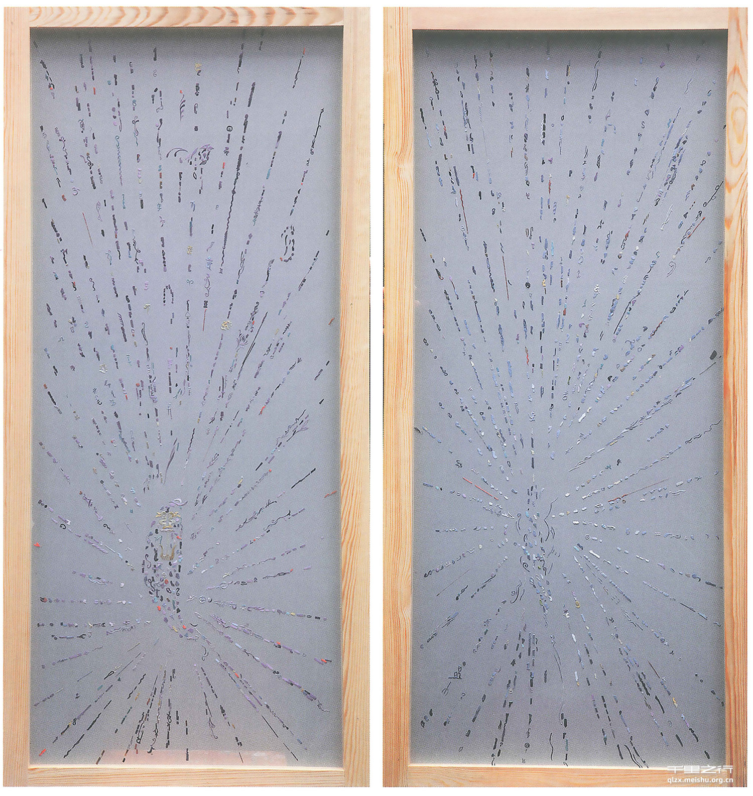 没有运用传统的表现题材,而是将西方现代抽象形式融入到创作当中,让现代气息融入到刺绣上,避免让人感觉刺绣作品给人一种古板的概念。将抽象与具象相结合,以或粗或细或密或稀的点为主,古代文字以及现代元素为辅,组成画面,纵横穿插,跌宕起伏,构成了一幅欢愉活泼,荡漾激情的生命与自然的乐章。然后将传统的丝棉线运用到极具透光性的尼龙纱网上,利用丝棉线的柔软性与光感性带给人们别样的感受。