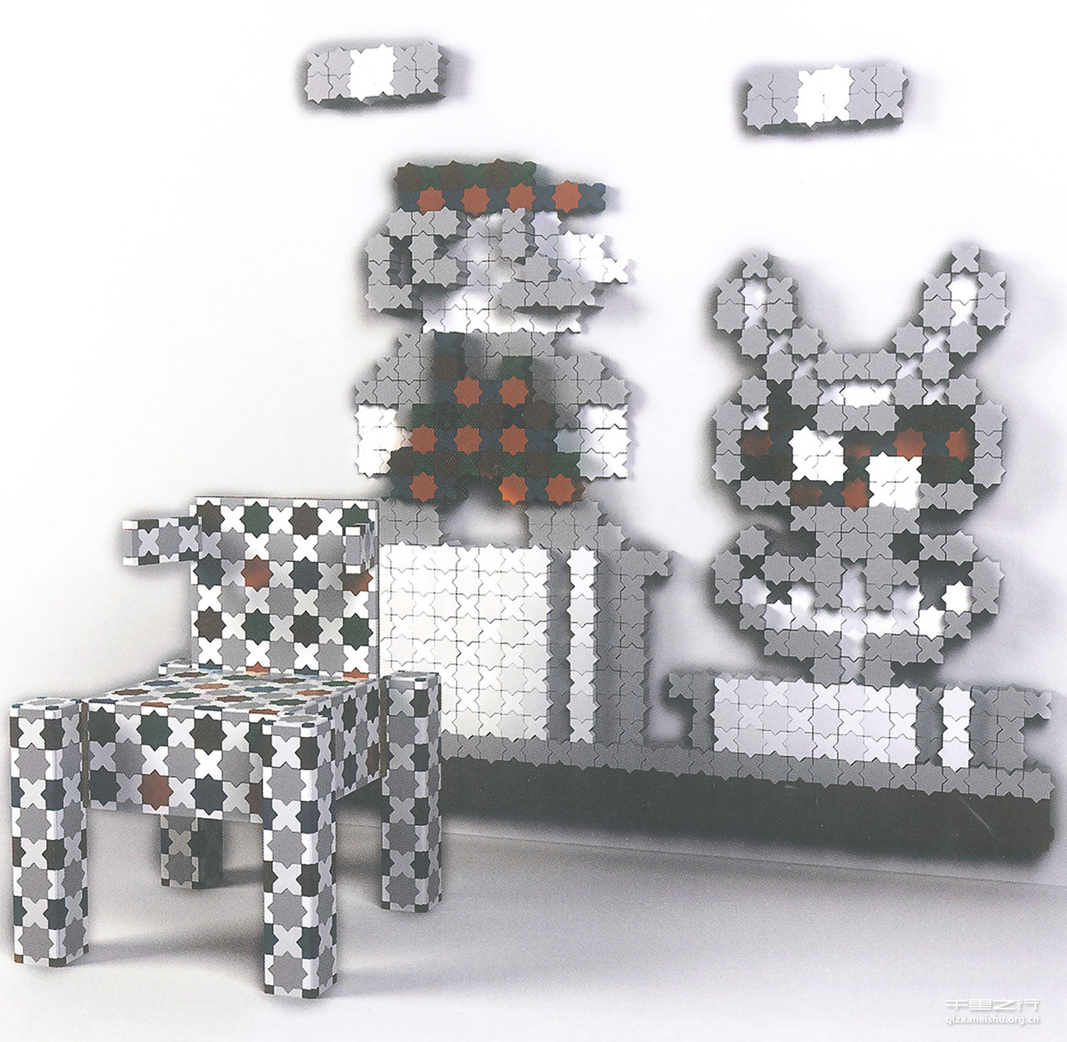《乐拓一~趣味家居装饰墙组合》受到乐高玩具和超级马里奥游戏的启发,造型采用像素化的超级马里奥形象,并融入传统摩洛哥马赛克配色,配合大量白色、浅灰色产生强烈的视觉列比。装饰墙由四组(每组凹凸图形零件各一个)总计545个长短不一的单体零件组成,通过磁性材料达到自由拼接,达到动手动脑美化居家环境的效果;装饰墙局部采用半透光亚克力和夜光材质,夜间能营造出温馨典雅的居家氛围。像素化椅子将抽象化的马赛克图形印于椅子表面形成魔幻有趣的肌理效果,复古而不失现代感的造型极具亲和力,传统摩洛哥马赛克配色使椅子整体散发着浓浓的异域风情,为居家空间带来无限生机。