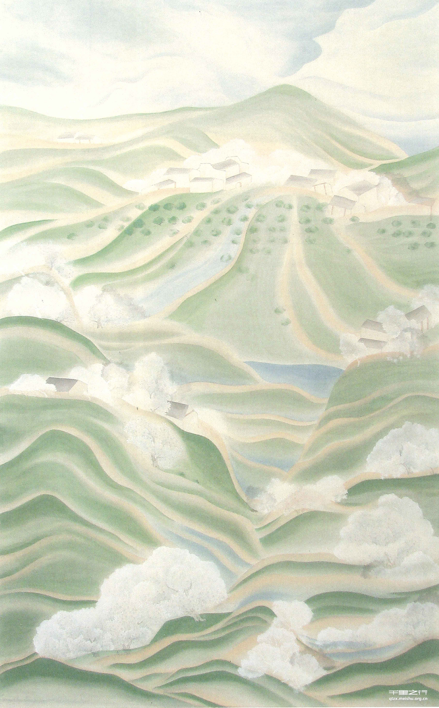 大自然的美,从来都是丰盛端庄的。郑重自持如同一种秩序,一 种道理。从孟浩然的“绿树村边合,青山郭外斜。”到白居易的“春来江水绿如蓝”和王安石的“春风又绿江南岸”,三个“绿”字都没有止于世俗之物,眼中之绿,那是种高于自然本身的情感描写,把客观的色调融于主观情感的色调之中。《春雨欲来》侧重以绿色为例,来表达田野间,春雨降至的气氛。