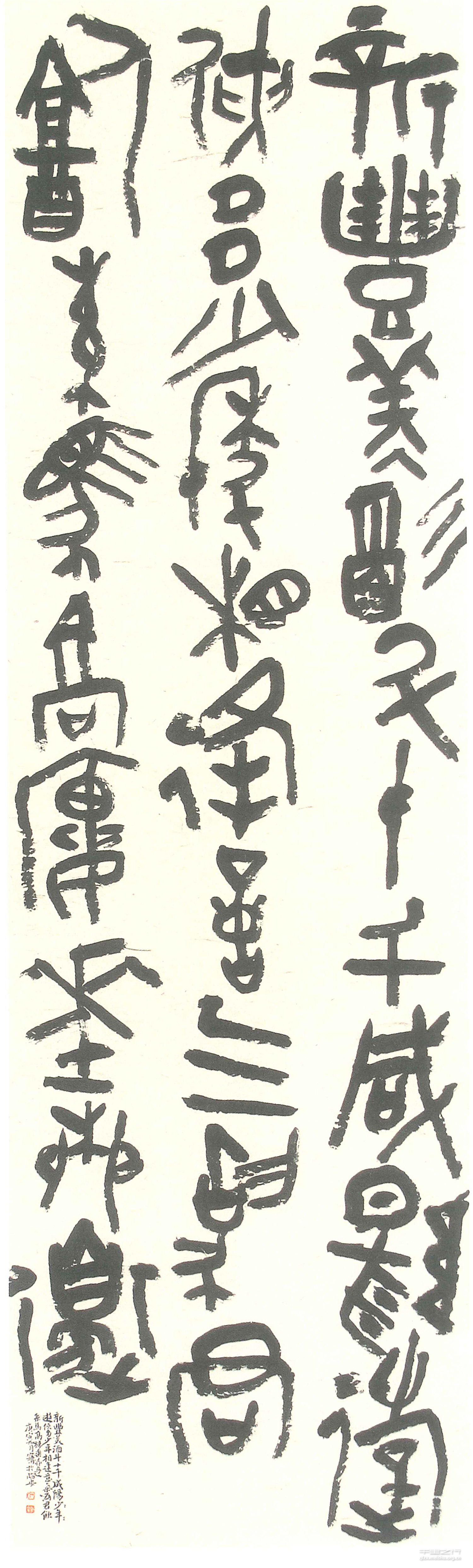 商周金文有因字生势,章法自然多变一路。意闲体和,风德雅重。这幅大篆创作是以这种风格为基调。在大篆创作中,取字取法钟鼎文会错失很多资源,罗振玉《赫连泉馆古印续存》“古玺文字自为一体,今自有与古金文,陶文及殷人卜辞合者。”同时商周文字字形变化丰富,如果运用得当,在在自发方面是可以取长补短的。我在创作中适当的借鉴了一些钟鼎以外的文字,用笔取法《散氏盘》,追求拙厚之质。以小楷落款,钤小印,为了拉开作品层次,增加对比。