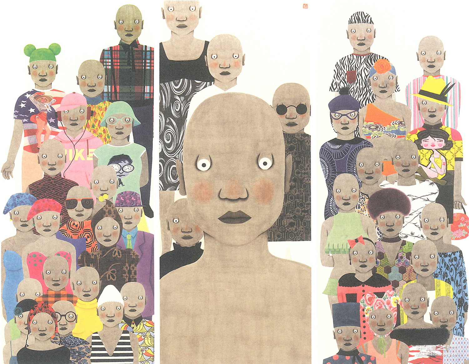 作品通过惊诧冷漠的表情及大面积的复制感来表达自己对于一 切事物的不确定性及寻找自我的意识,中间未着装的形象不仅是代表自己也代表对于世界同样有疑问的每一个人。用色上近似动漫用色,来追求一种现代感,一种脱离古典绘画高级感的样式。人物形象的设计上,通过有些怪异的服饰来表达人物气质及时代特色,加强一种手足无措的迷茫感。
