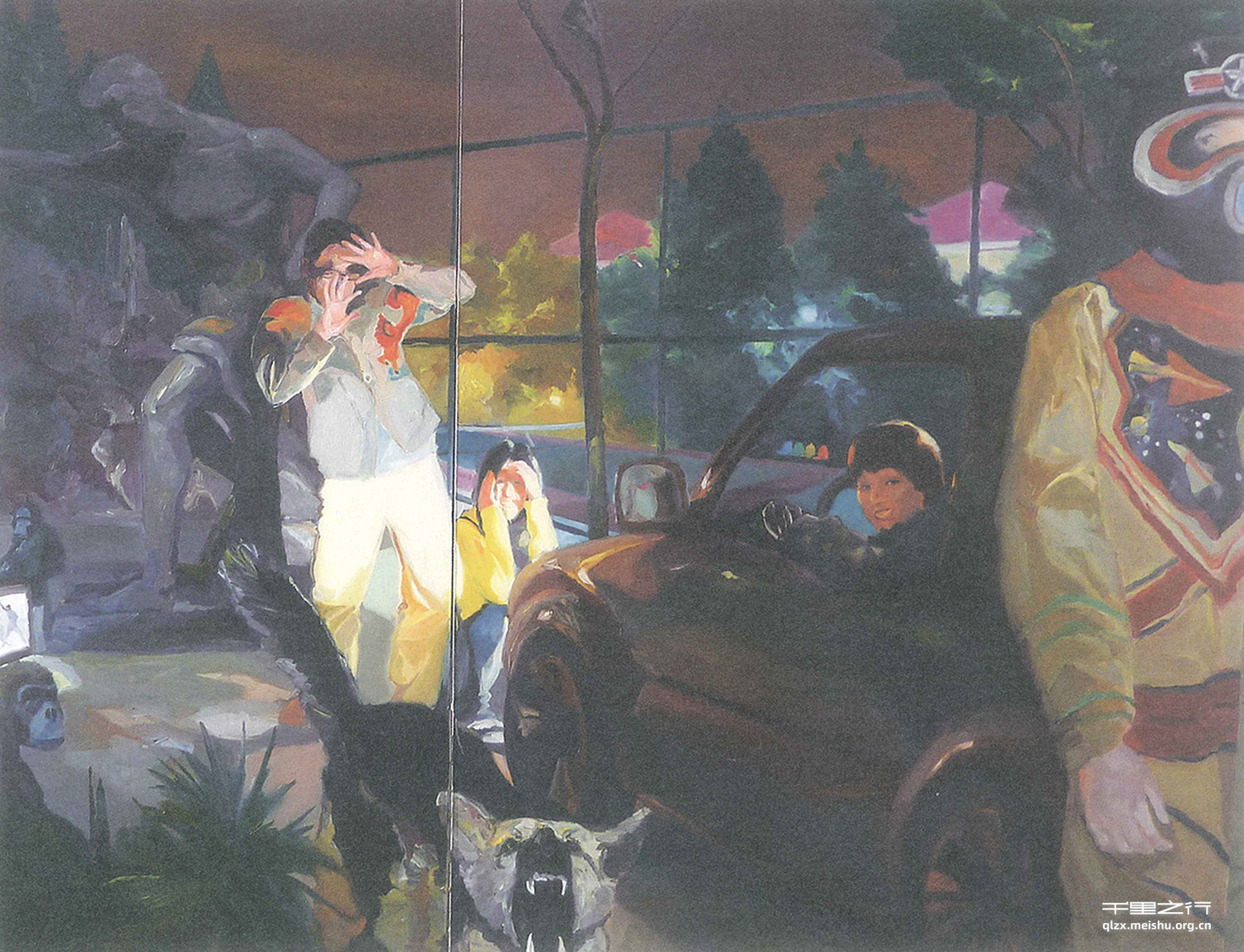 《别了,纳尼诺》是皮亚佐拉为纪念父亲写的音乐,这是我最 喜欢的一首曲子。我想在画面里表达一种强烈的矛盾:一种紧张和宁静的矛盾。车灯照亮了两个人物,其中一男子不堪强光照射拼命用手挡在眼前,躯干后倾,几乎要摔倒的样子;画面下方的狼狗正在面对观画者狂吠。这些形象都让人感到紧张,惊悚。然而,强光下的另一位年轻女子却手托下巴面露微笑,车内的女孩也将头探出窗外,一脸轻松自在,画面最右侧身着太空服的人则一脸冷漠,扮演着局外人的角色。两组形象互相矛盾,彼此冲突,却又被安插在一个场景之中。