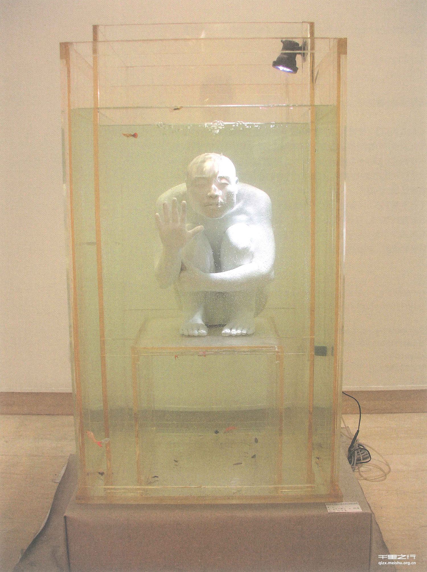 随着全球气候的变暖,海平面水位不断增高,有可能在不久的将 来,地球将会变成一个海洋的世界。雕塑是一个1.2米高装满水的有机玻璃鱼缸,来模拟未来水世界,以引起世人对环境保护的重视。
