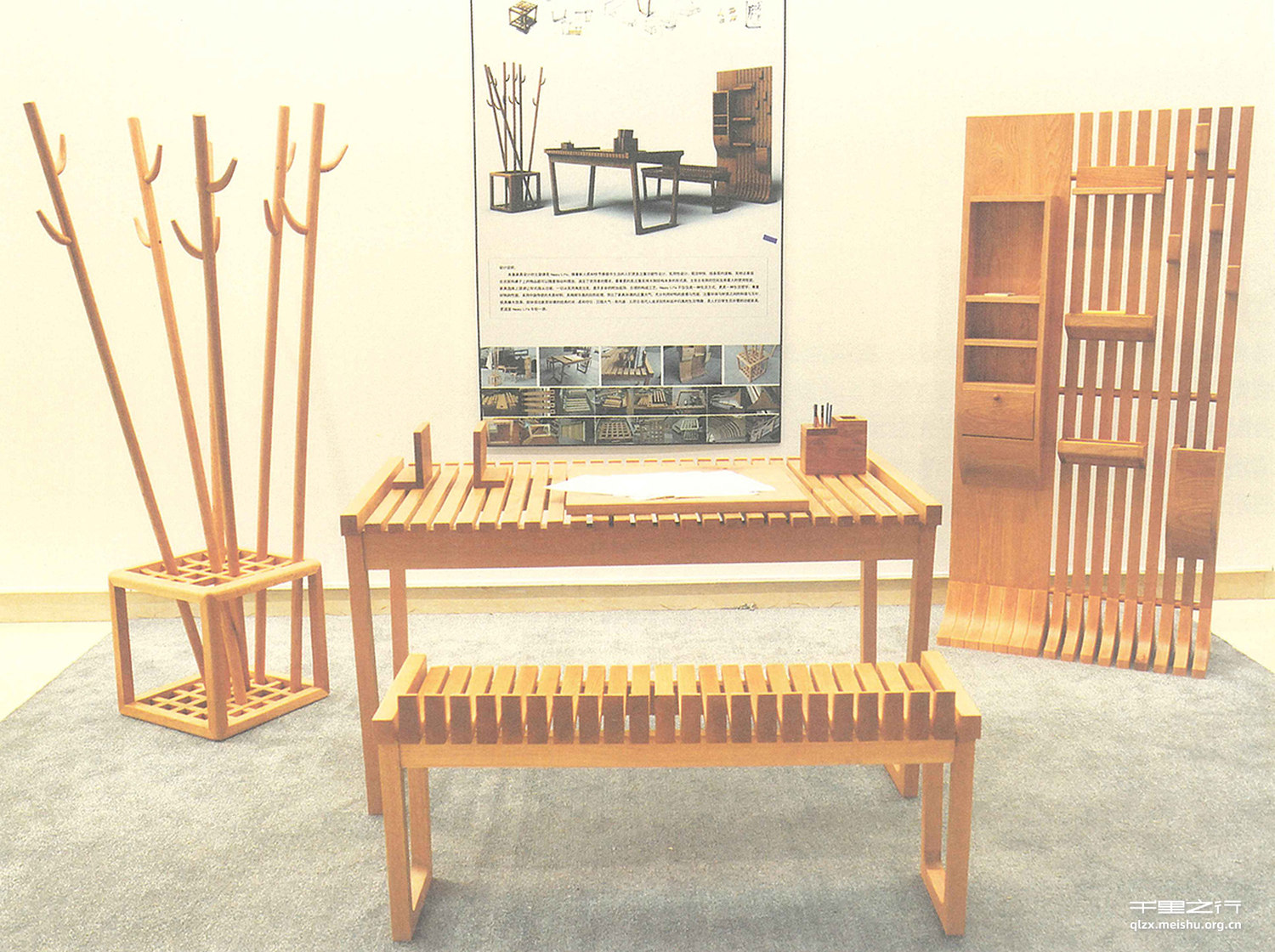 本套家具设计特点在衣架和桌子上,强调让形式服从功能,一切 从实用角度出发,废弃多余的附加装饰,合理的构成工艺。采用中国传统的木质材料,其绚丽华美的自然纹理,突出了家具环境的庄重大气,充分利用材料的质感与性能,注重环保与材质之间的和谐与互补,既体现出家居环境的经典时尚,沉稳大气;又符合现代人追求自然和返朴归真的生活情趣。