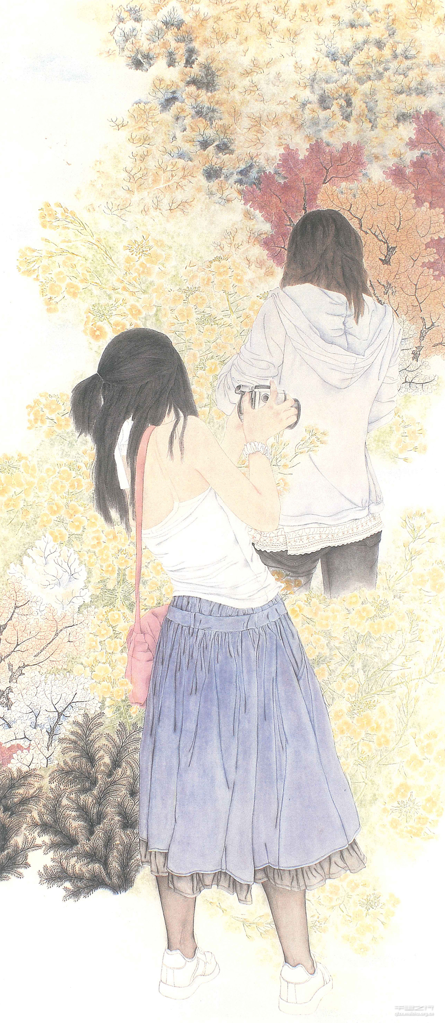 创作的题材选择,是贴近自我状态上的表达,画面是一种心情 的诉说。展现现实的人物,半现实的场景,带有山水的元素和山水的气场,运用单纯的人和花诉说一种平和,以及遭遇古典绘画的宁静。以旁观者的眼光选择和刻画主体人物,以一种自我的状态参与到其中。这幅工笔人物的创作,只是一个载体,是体现情感的一种方式,是真我的一种展示。工整细密的绘画风格,单纯的人物造型,田间常见的花卉,经典的古代绘画,构成了整个画面。