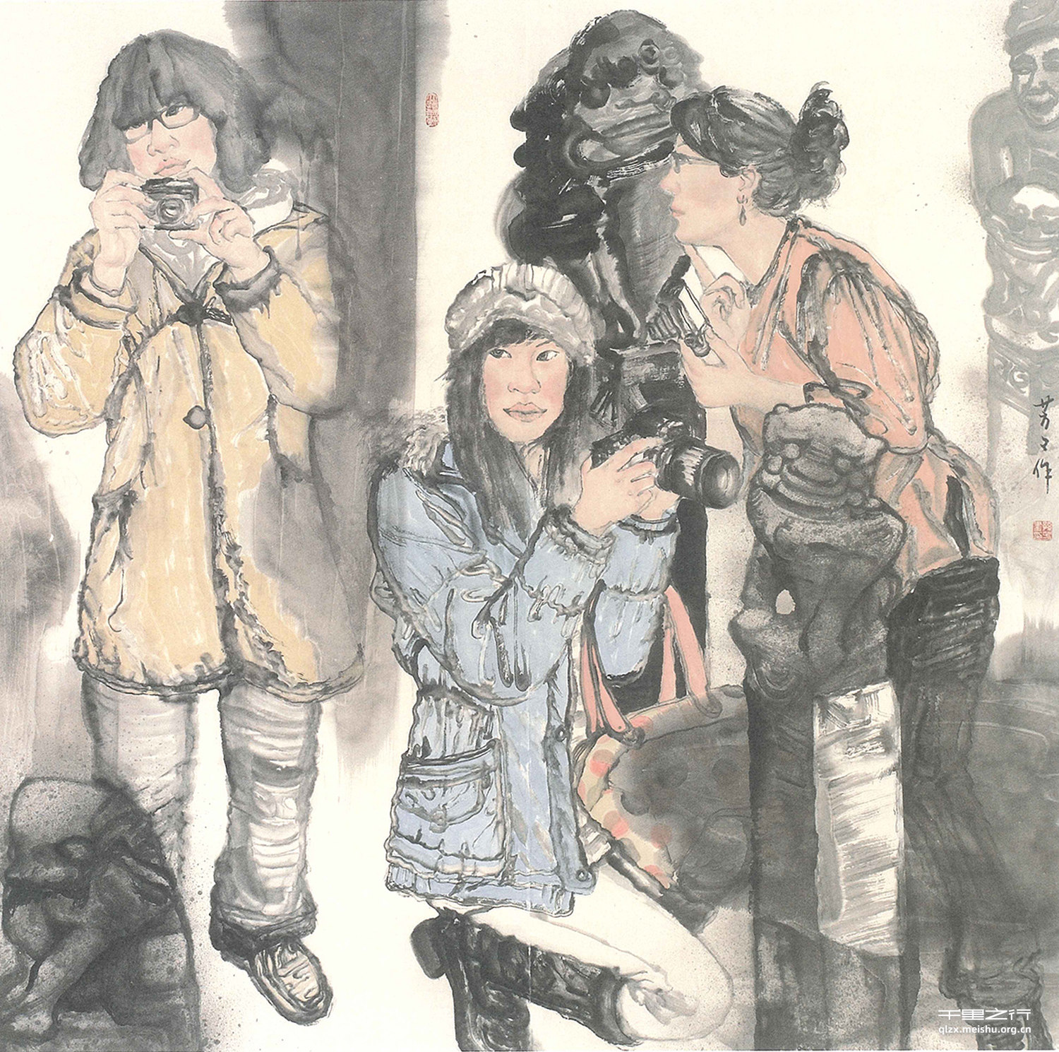 作品以水墨的形式表现生活中每个人摄影时专注的姿态,以女 孩们为对象,用我的镜头去描绘她们在那种情境之中的意韵。以美院拴马桩为一种过去沧桑的情境气息,突出所要表达的意境,也是与现代生活记录方式的一种对比,不同生活的不