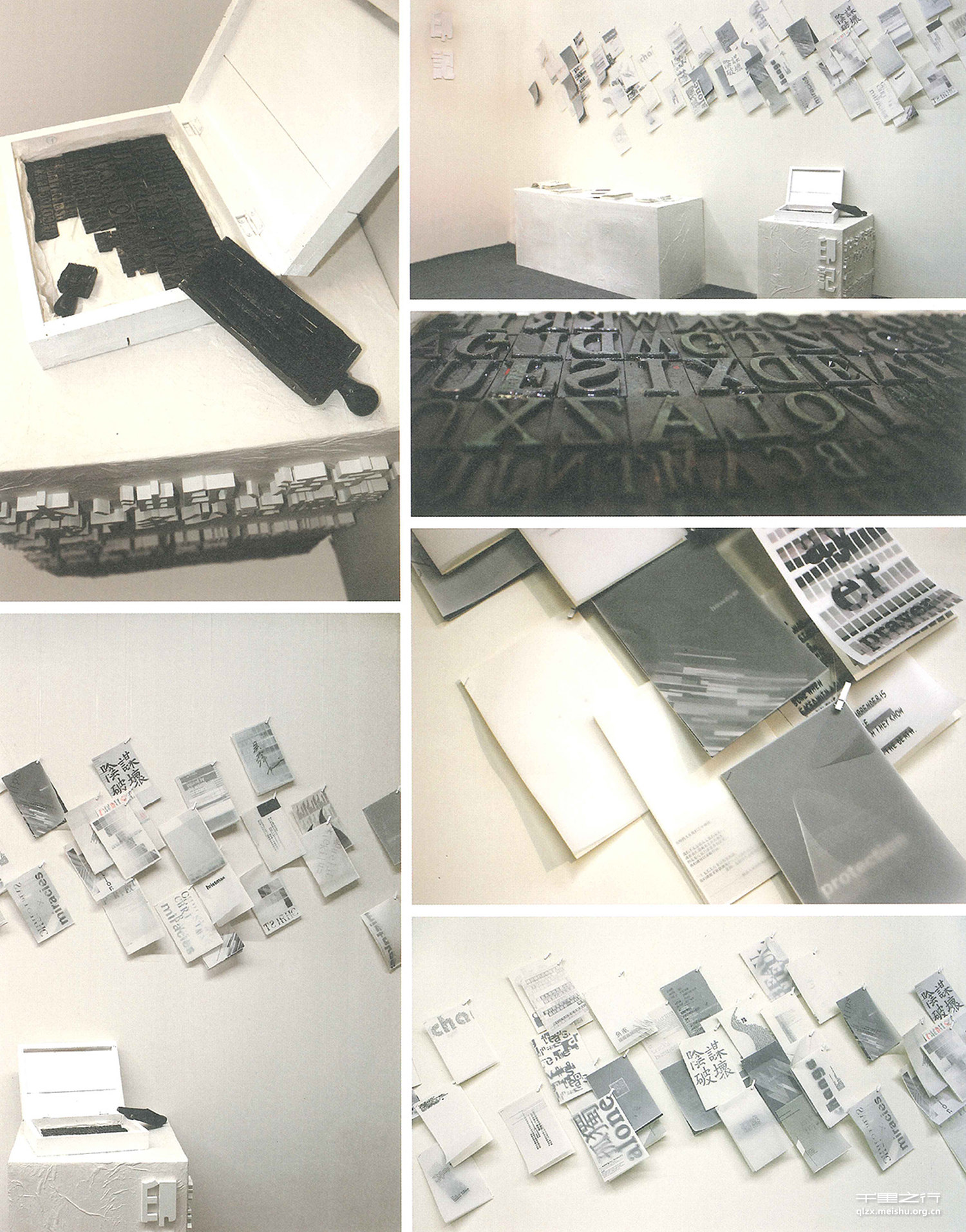 灵感就来源于中国古代四大发明之一的活字印刷术。我将交互 式设计的理念运用于书籍设计,旨在建立一种人与书的关系,即读者在阅读的过程中可以手动油印,记录自己的情感与记忆。这种开放式的设计,最终呈现的是书中现代印刷技术的规整制式和后期活字油印的肌理形成强烈的对比。这种和谐的韵律之美也表现出纸本、油墨的独特的魅力。