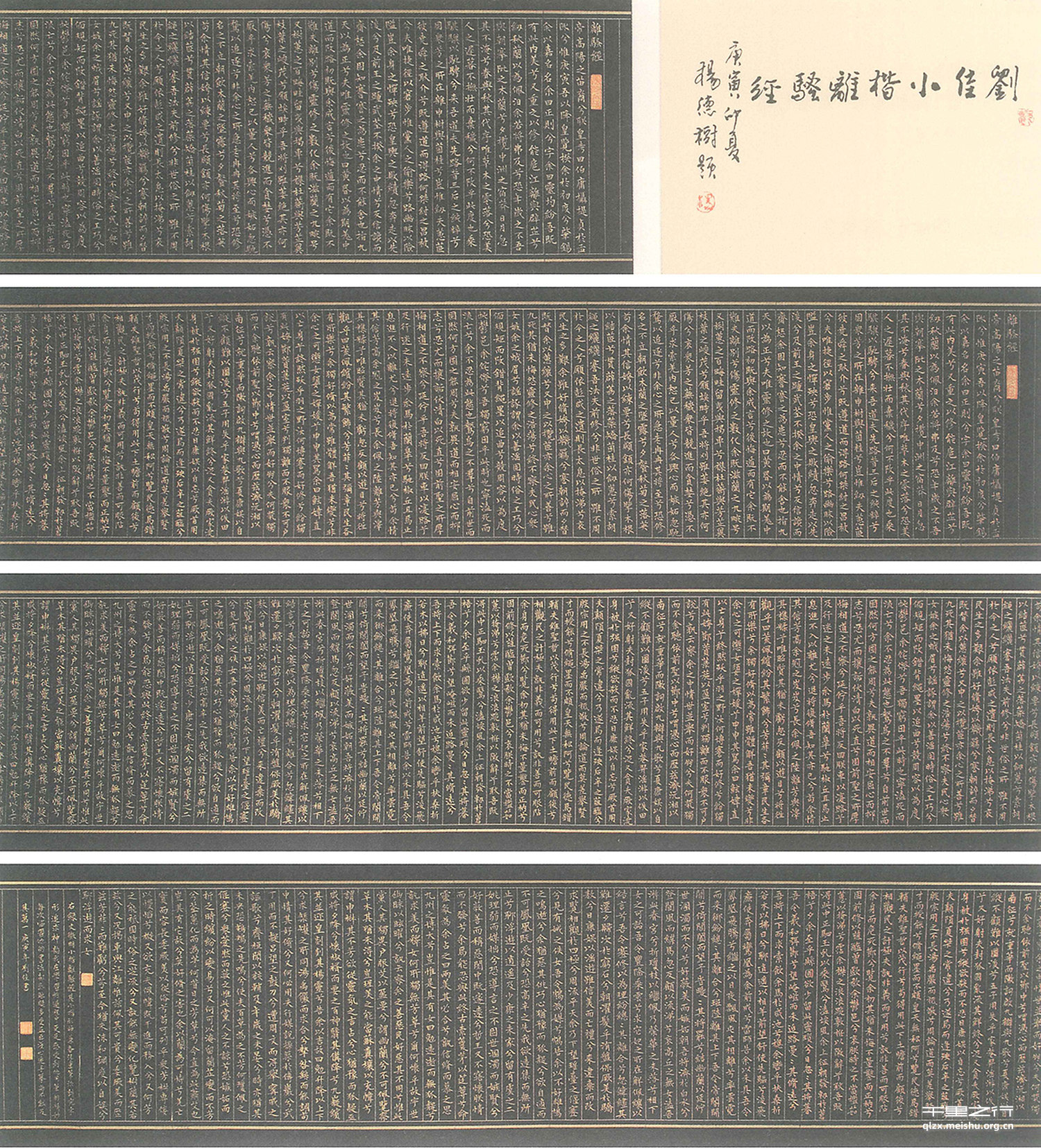 作品在用纸和墨的选择上,选用的是深蓝色的色宣,并用金色的 颜料来书写,加强了作品给人的视觉感受。总之,这个作品在教师的指导下,在选择书写内容和表现手法上都比较讲究,是我近几年创作出的比较完整的作品。