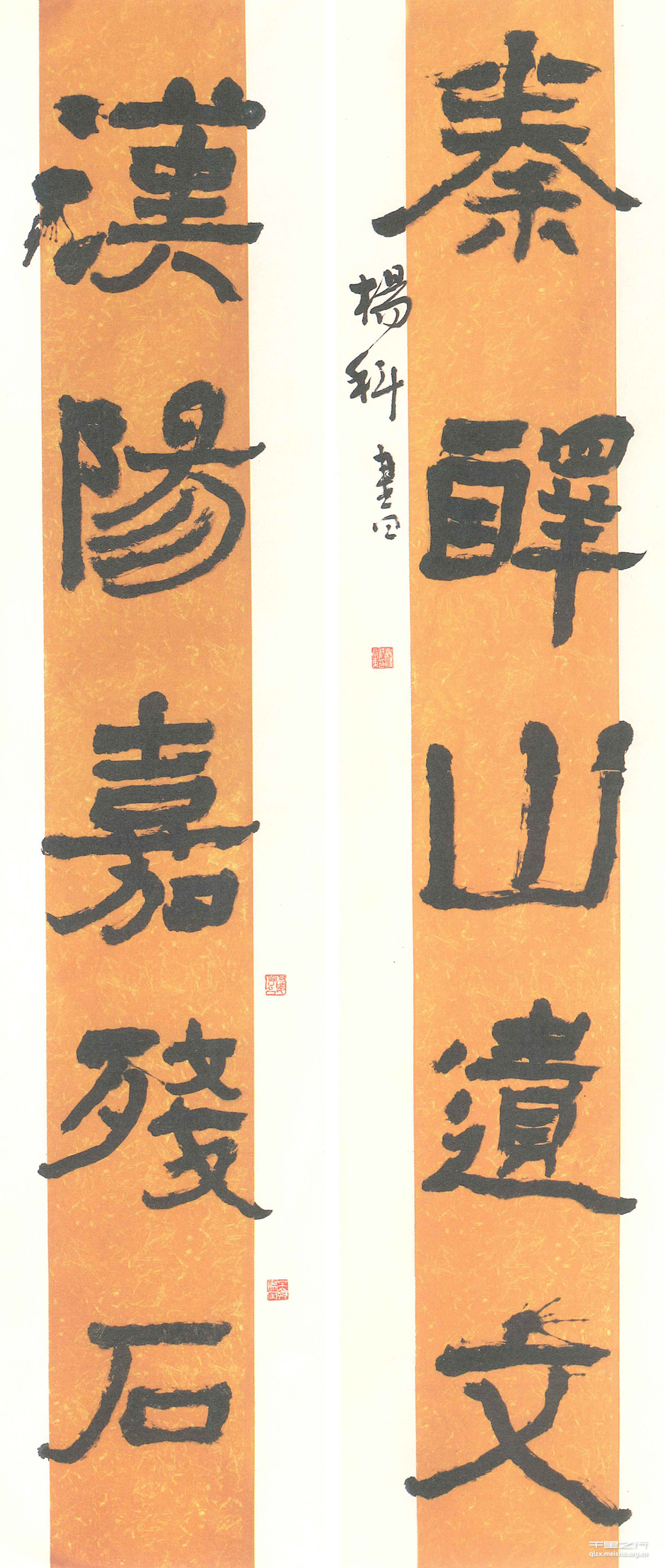 愚极喜欢汉碑,石门颂以及摩崖石刻的豪达、跌宕的意气和自然 质朴的本真状态。曾多次临习,时毕业之际用摩崖凝重的用笔和富有快慢节奏感的用笔速度创作,欲表现拙朴浑厚的线质和豪达跌宕的胸中意气,故书此对联。