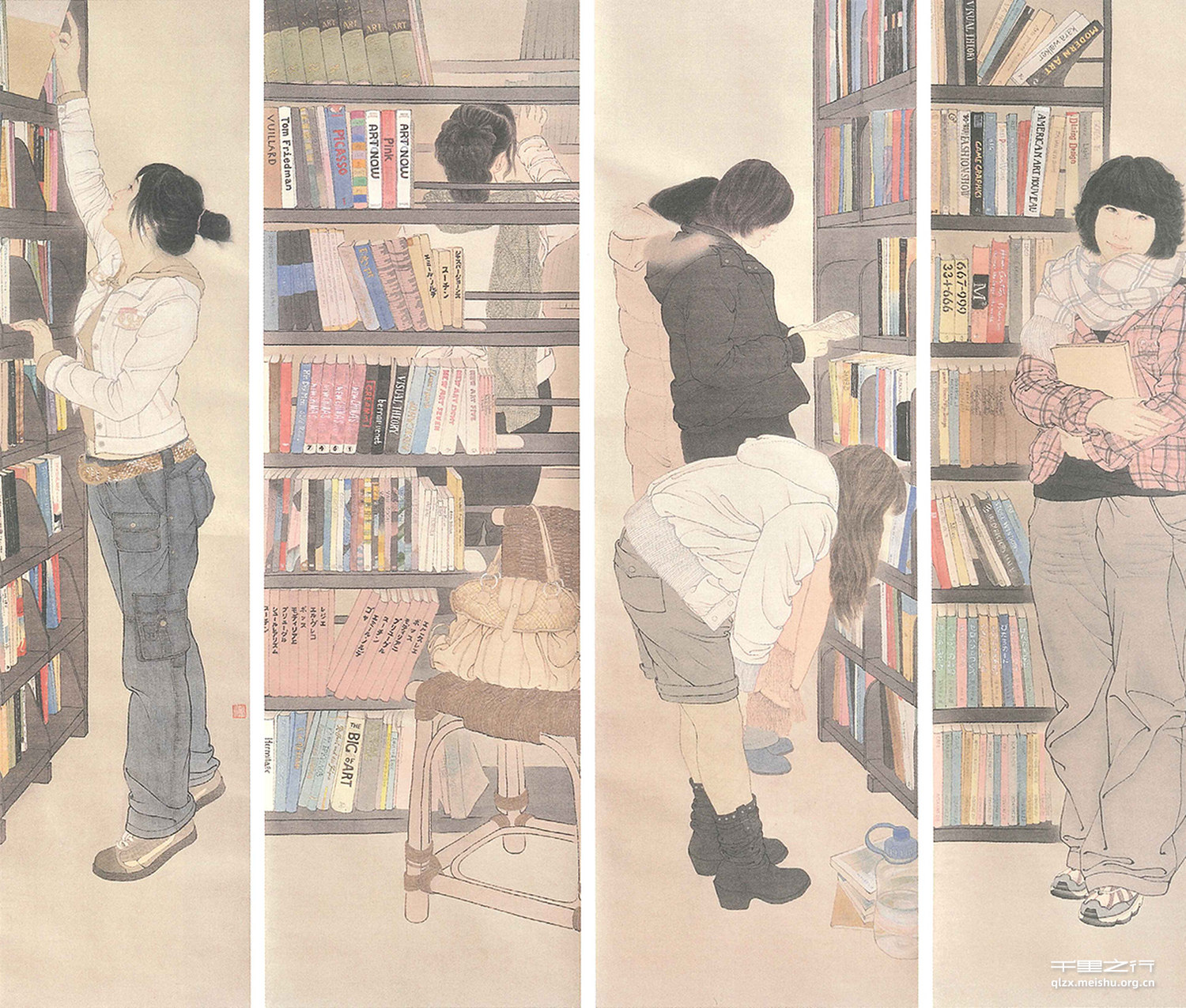 知,即求知之意。在当今物欲横流的社会,大学生这种纯净的对 知识的渴望与在知识海洋里遨游的专注神情吸引着我,感动着我。于是我采用了四条屏的形式,以书架作为画面的支撑,将大学生看书时的不用角度、不同状态的美好瞬间记录下来,展现了中国当代大学生的风采。