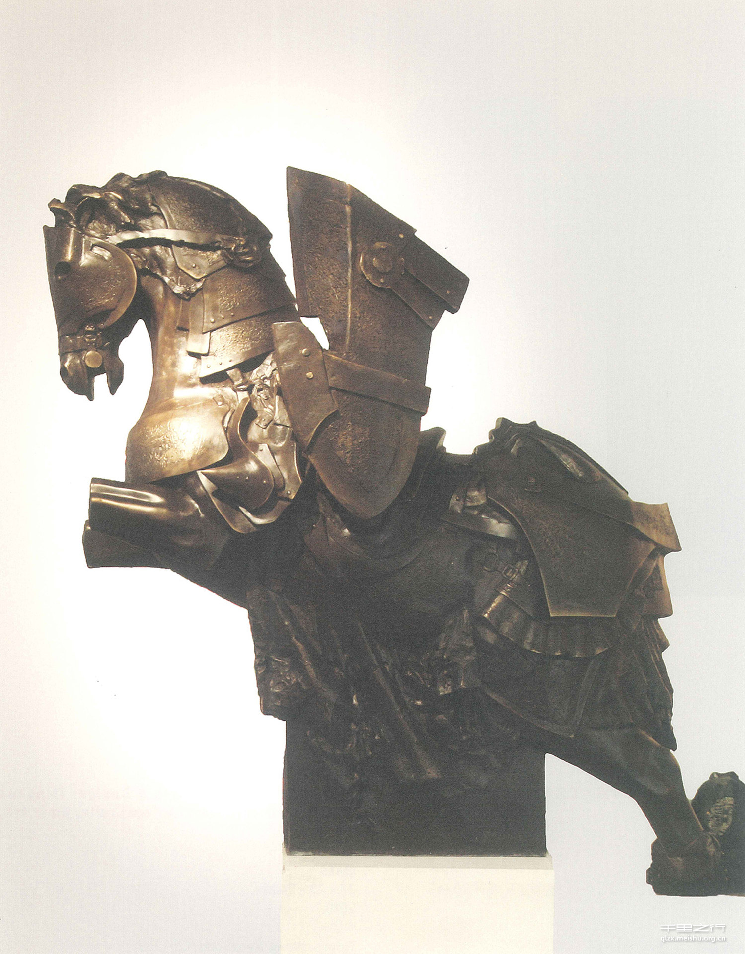 和平年代,烽火与硝烟已经渐行渐远,但战争似乎没有停止,而 是以别样的形式存在着;文化争疆、经济扩土或是与对手激烈的竞争,也许你正面临着一场“战争”或已身在“战争”之中,上马而战还是卸甲求和,人的选择是非常重要的。我的雕塑选择用一匹战马作为主体;名称为单骑;一人一马为一骑,但是我去掉了骑士,利用艺术中空间的互相占据手法,用盾牌替代骑士的位置。作品中不出现人的实体,反而是强调人在战争中的决定性作用。