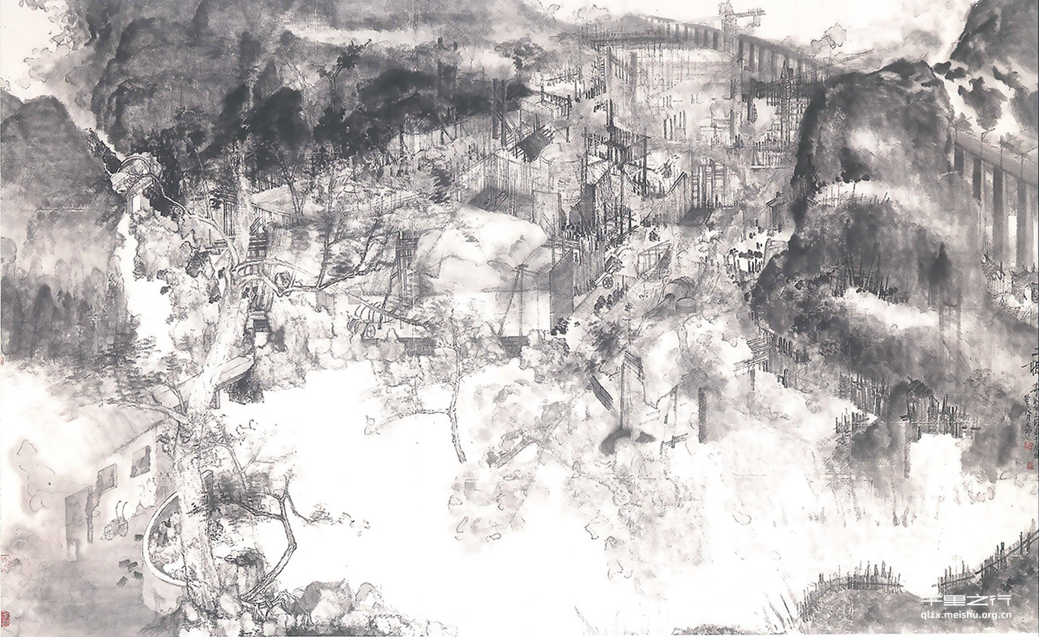 《印象齐云》以安徽境内齐云山为创作题材,以立轴形式描绘齐云山的行居。作品由近及远,写齐云山的灵秀和厚重,用粗犷的笔调灌柿整体,把齐云山的俊秀、浑厚和密重表现出来,在作品的前景中以虚白打破山体的憨实,绿树成荫,再加上由远而来的山溪路径,使画面中的山头厚重而又灵动。传统、当代、题材、笔墨、思辨都在拷问着我们,作品是时代的烙印。所以我们要行思,履远。