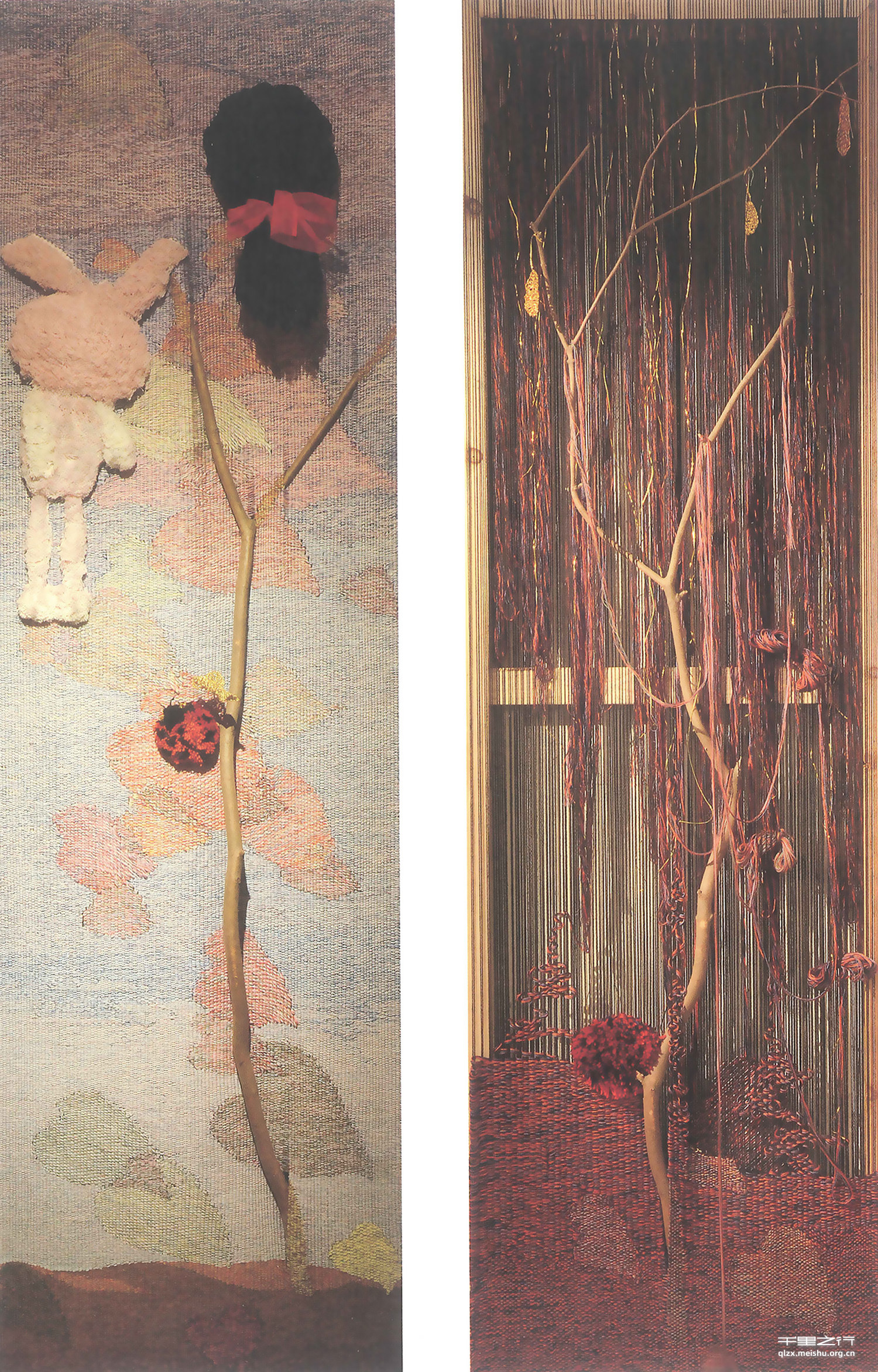 作品中加入了树枝,想“以树喻人”,通过另一种不太一样的表现方法,创造出属于壁挂的“空间”,使其更加符合雕塑的意义。我希望努力去寻找编制艺术中属于雕塑那部分的空间形态,从随意弯曲的树枝上,?不断去转换与平面编织的穿插关系,希望作品中空间的感觉更加强烈,希望自己作品传递出了一点属于雕塑的空间语言,更希望可以传递出一种舒适、温和的“爱与关怀”。