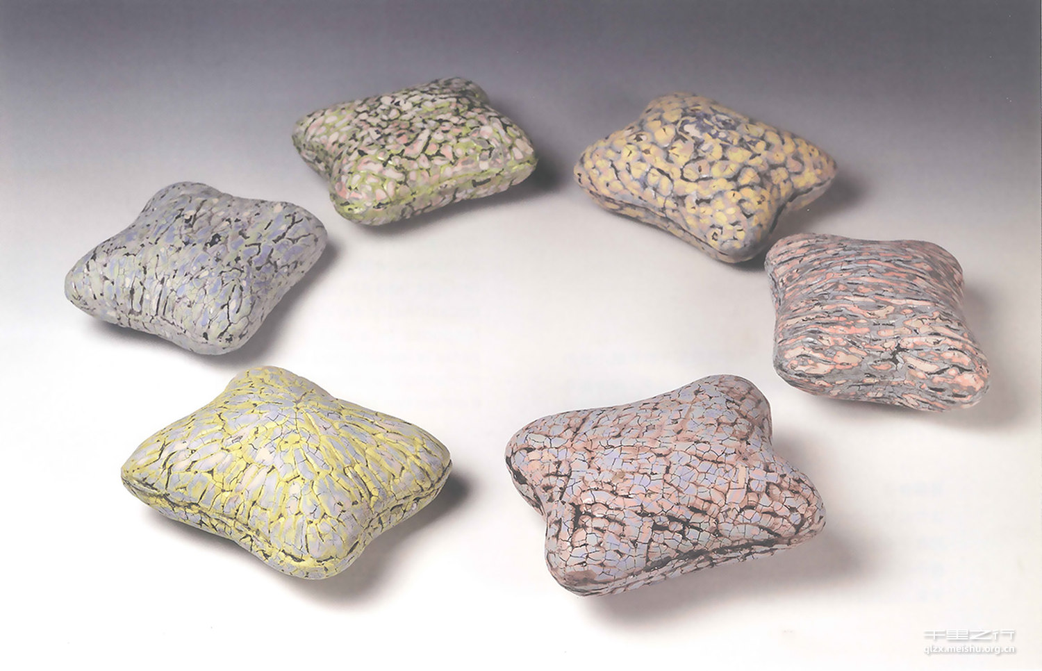 取最平凡的小枕,推出原始极简纯粋语汇。经模具、捏塑、纤维陶、多次化妆、多次烧成、抛光打磨等复杂工序完成。贯穿始终的,是一种探究的精神。陶瓷色彩语言应用的新修辞,使作品呈现出斑斓纷复而又微妙轻曼的光影交叠。枕边的梦想,是对青春的激动期许,也是对稍纵即逝的生命美好的叹息。