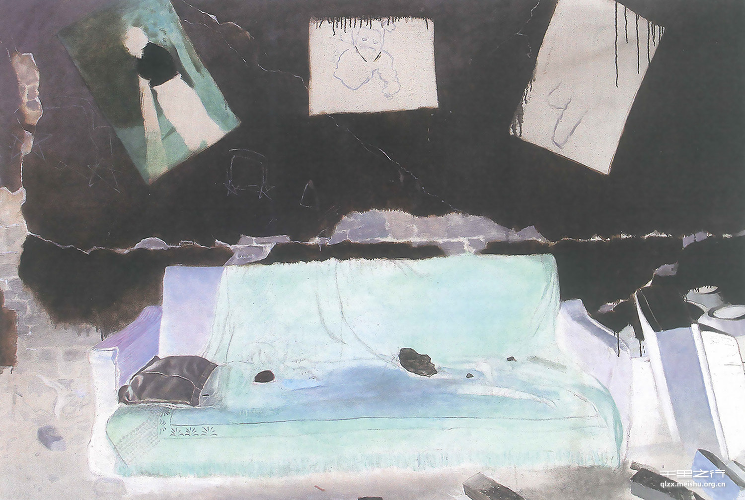 跳出以往的视角,从负像形态观察对象,画面产生一个逆向解读,这种解读过程留给观众一个想象的空间。黑色残破墙面前醒目的沙发上零落着灰尘和碎砖,墙上三个不完整的小孩照片和涂鸦仿佛让人看到屋子在地震之前一家人的美满生活。