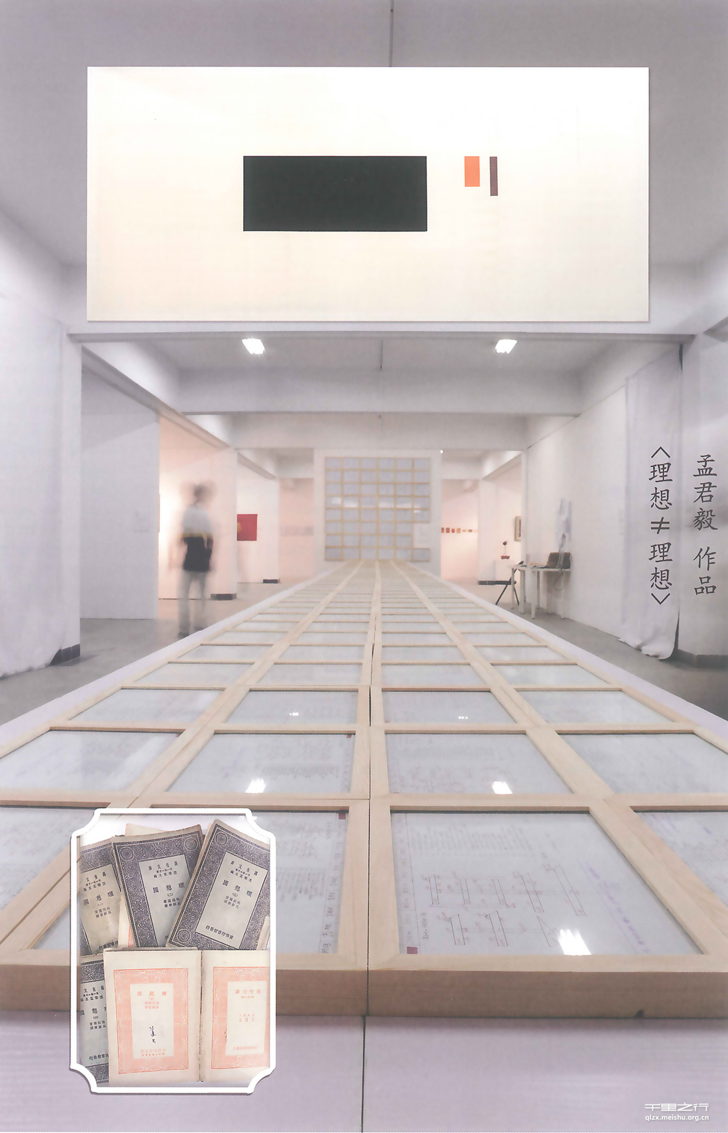 孟君毅运用几何的原理与计算方法,同时使用千分尺测量与计算了 1929年中文版《理想国》中的所有非白处的面积。孟君毅不仅运用三角形、长方形、梯形、平行四边形、圆形、椭圆形等计算公式拆分测量了每一个文字,而且也拆分测量了书籍封面与封背的所有图形。最后将油墨部分的面积总和计算出来再重新印在一张《理想国》所有纸面积总和的纸上。整个作品分为两个部分,观者首先看到的是印在一张白纸上的几何抽象图像,之后看到是计算《理想国》的所有步骤与图例。由此,孟君毅完成了将具有语意的文字转换成图像的所有过程,并产生了新的“语意”,也完成了对于“理想”的理性疆域划分。