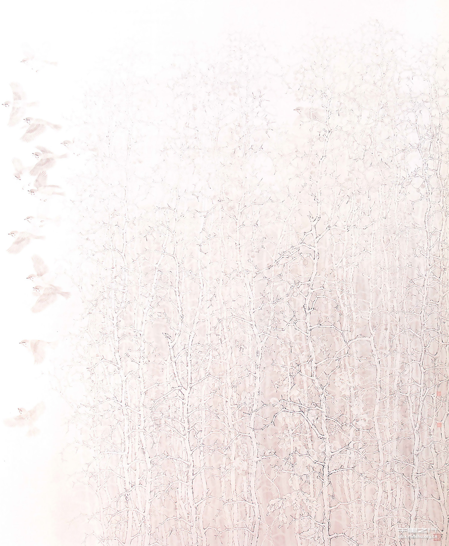 《疏林寒影》这幅作品所绘的是一片冬曰的酸枣树林,清晨间一群麻雀叽叽喳喳地唤着相拥飞出了林子去觅食。静谧的树林与啼鸣的鸟儿一静一动,形成鲜明的对比。画面整体采用了形式感略强的构图,用单纯朴素的技法来表现,没有过多的颜色,没有过多的技巧。酸枣树与麻雀虽看似不起眼,却也生得一份朴实自然。这也正契合我所崇尚的返璞归真的审美观。