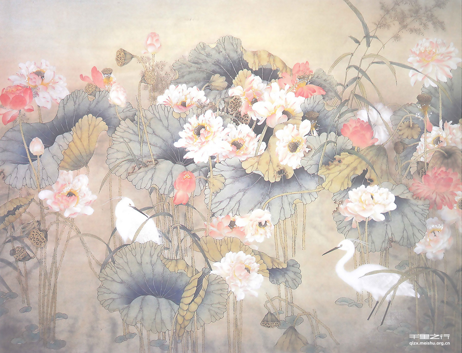 《夏韵》这幅作品色彩掌握有度,表达出了荷塘湿润的感觉。洁白悠闲的鹭鸶,与静静的荷塘相得益彰,花繁却不张扬。这幅作品很好地阐释了作者的内心世界。