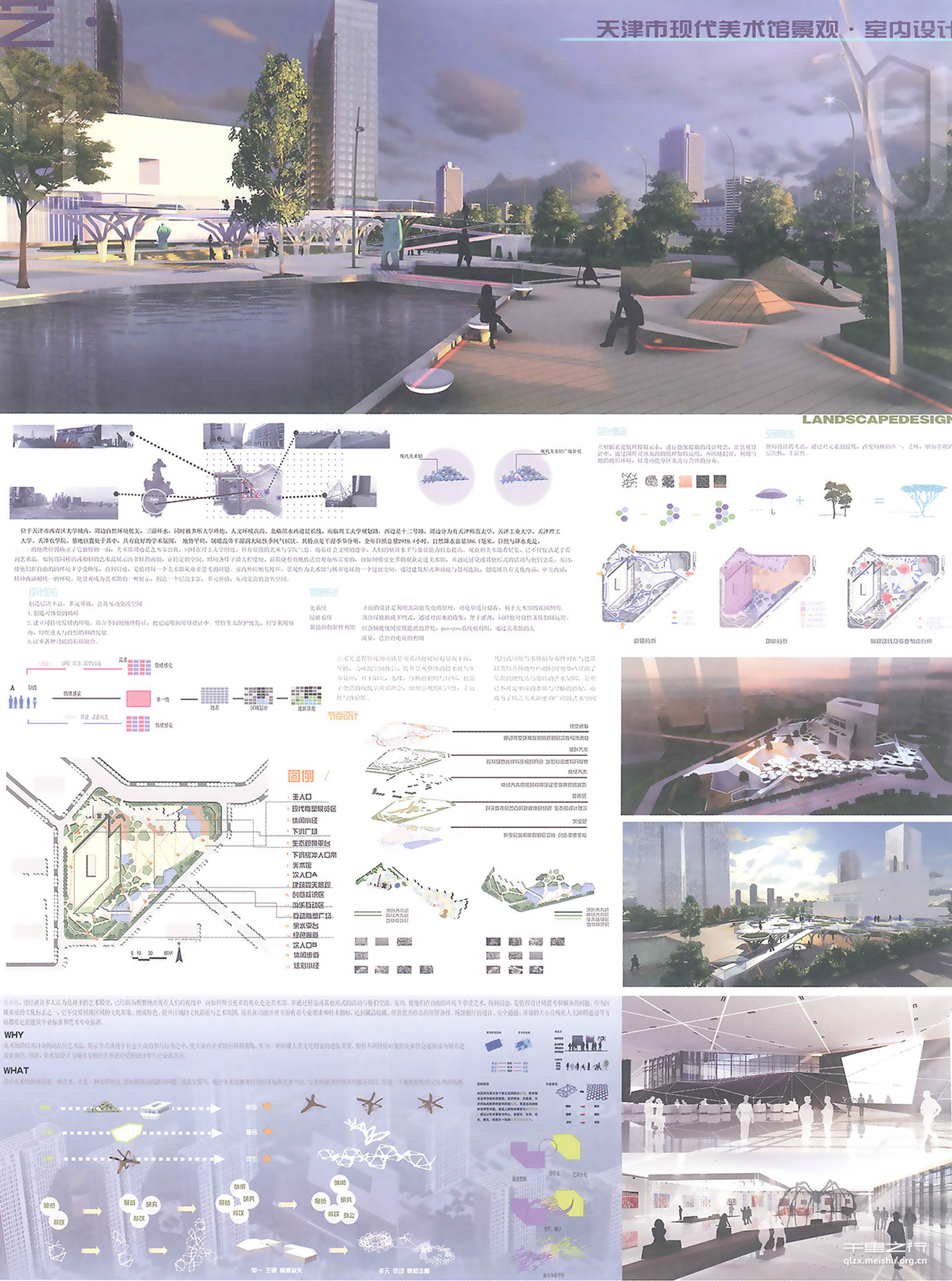 该方案以“天津现代美术馆”室内及建筑附属景观为研究对象,针对缺乏艺术氛围的场地现状,以及现有面积狭小、利用率低等问题,通过充分调研分析,提出了策略性的设计解决方案。同时,通过独立思考和创造性构思,具有较强的探索性。美术馆不仅仅只是文化标志,更重要的是使大众能够参与其中,获得艺术熏陶。其方案的独到之处即在于围绕这些问题提出解决方案,营造了一个大众参与性较强的文化休闲场所。
