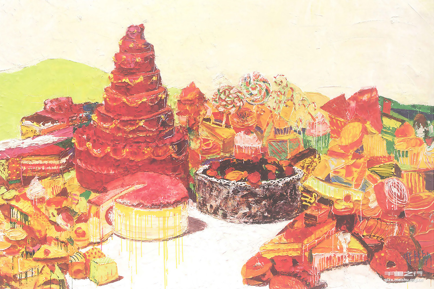 艳丽的色彩使得图中看似普通的甜点显得怪异却又不失纯朴,这些甜点代表着当今年轻人追求的梦想。早在古代的欧洲,贵族们就养成在下午茶中享用甜点的习惯,因此甜点是一种奢华与放松的象征。图中各式各样色彩缤纷的甜点激起观众对绚丽生活的向往,并唤醒人们记忆中对美好生活的憧憬以及各种简单却浓郁的欲望。
