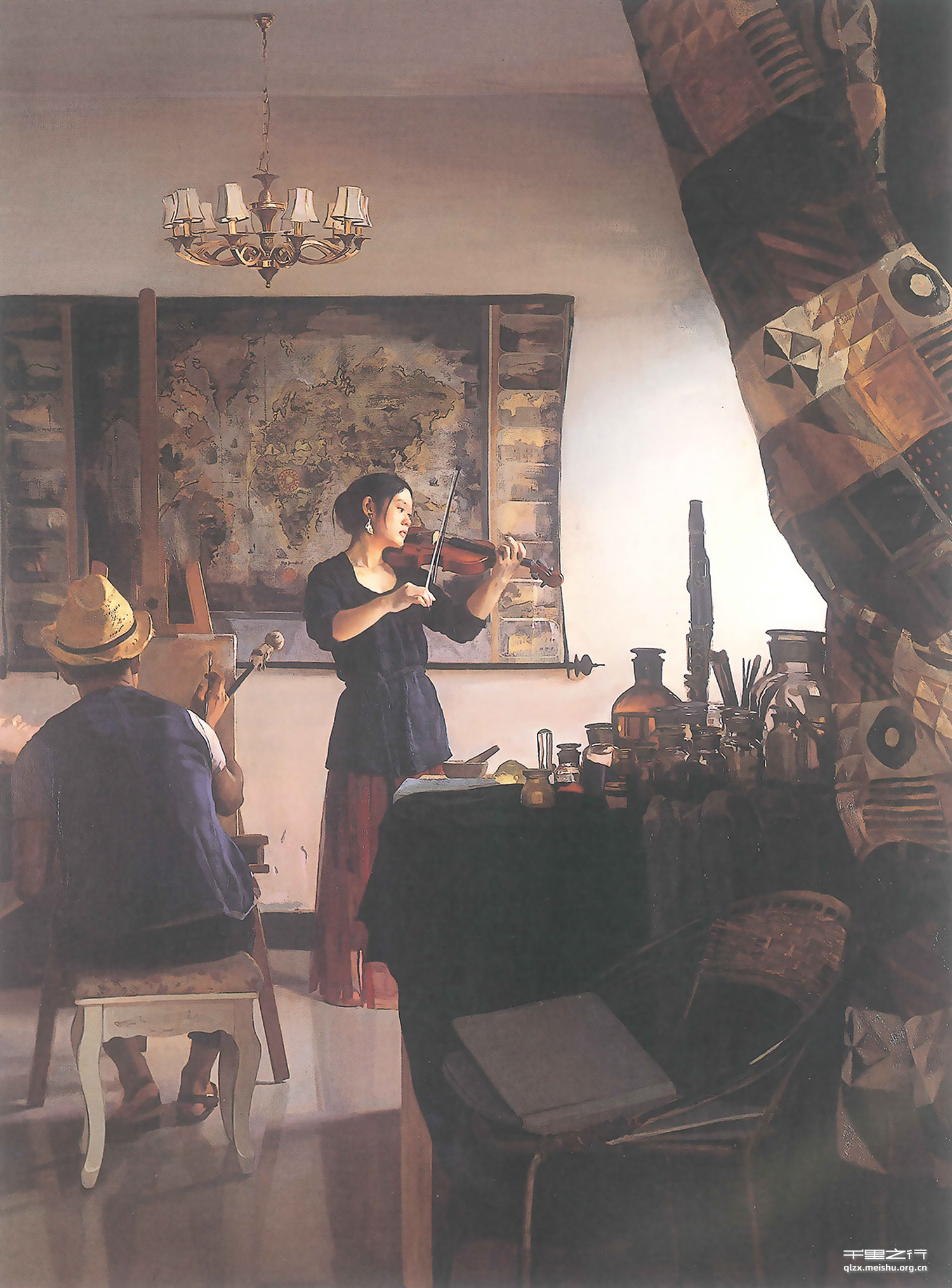 这是一幅描绘画室场景的油画,画面的构图以及手法皆为了使画面富有凝聚力,来传达一种视觉美感。