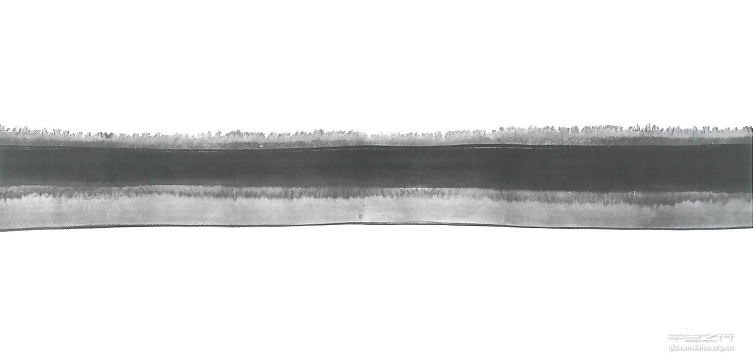 刘蜀同学一直钟情于水墨的风景表现,画了上百张形式感很强的小稿。在过程她把她作品中各种极具特色的“线”抽离出来,在丝网分版上巧妙地利用了边缘的穿插,形成了四米多长的无缝效果,把“线”放大变成很单纯很有冲击力的画面,让人过目不忘。