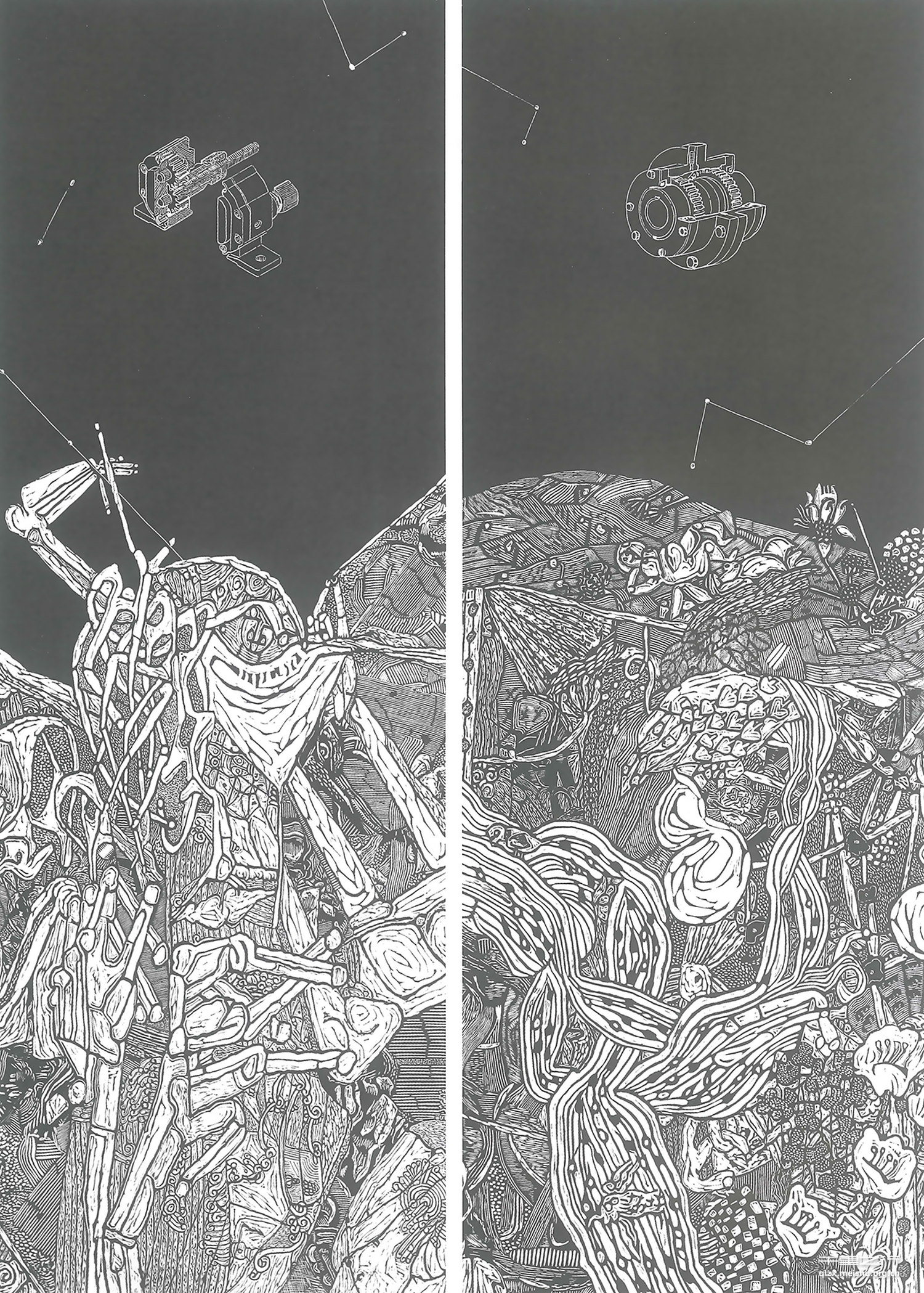 从原始社会第一生产力到人类社会第一生产力出发,以蛮荒与文明为题。将作品形式定位为组画共计四幅,其构图分为上下结构。分别将其定义为天界意象、树怪梦意、史前留存、幽灵吟颂。作品中的科技文明符号,象征人类社会代代出新的产物,是在唿唤被工业异化下原始粗放的人性回归。上下部分的视觉表达主题是蛮荒粗放与文明价值的对话、魔幻般的意境彰显了荒诞思潮的主观意识。作品中有趣味的星象图线似光泽与幽玄意旨,隐透出新星般清新的惊愕与“幽微闪烁”,不仅取美好愿望之意,也充满希望。