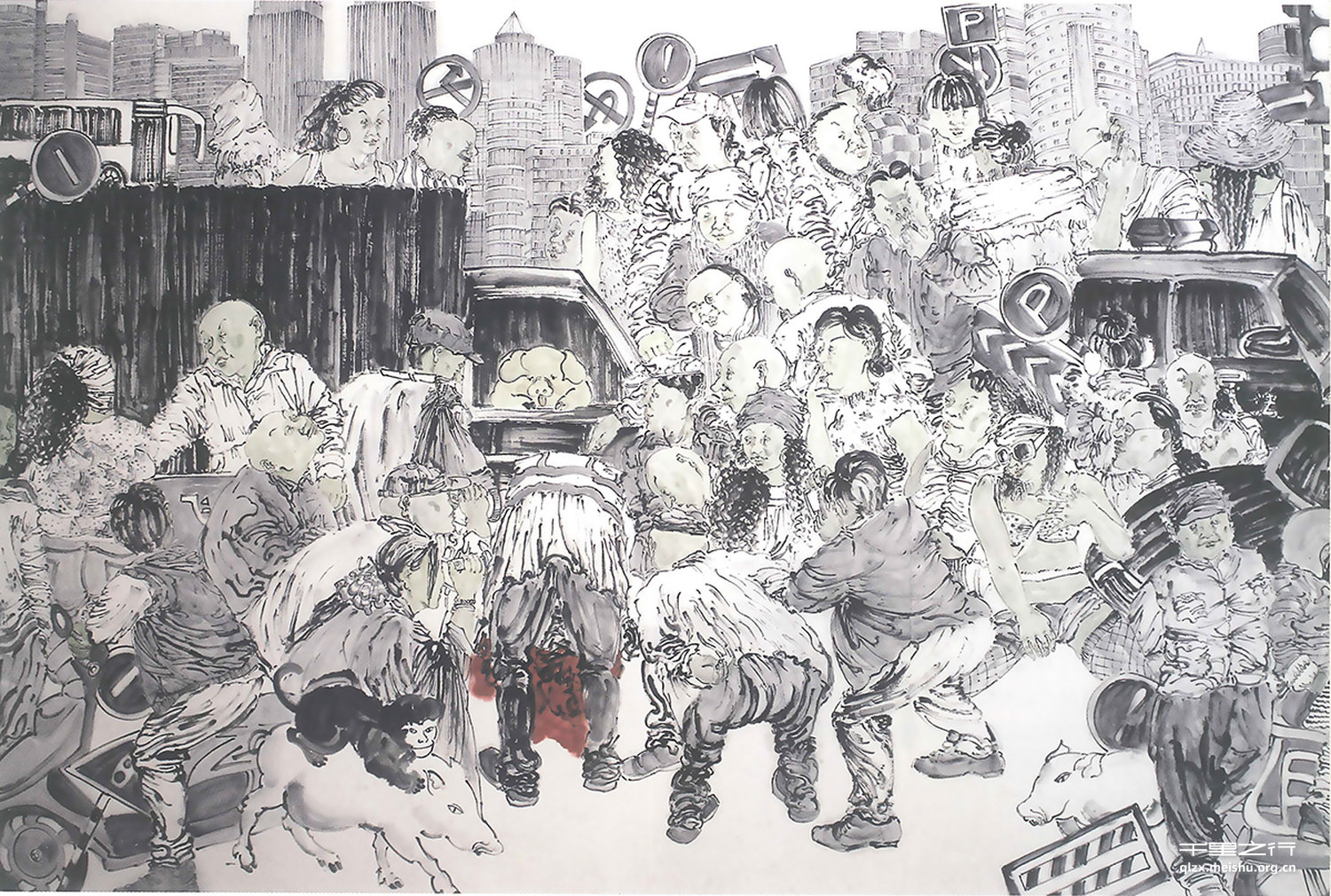 陈针的作品《车祸现场》是作者深入观察生活,对自己所认识的社会现象深刻反思和思考之后,通过自己的笔墨表现出来的。同时,希望能够引起人们对机械文明的反思。