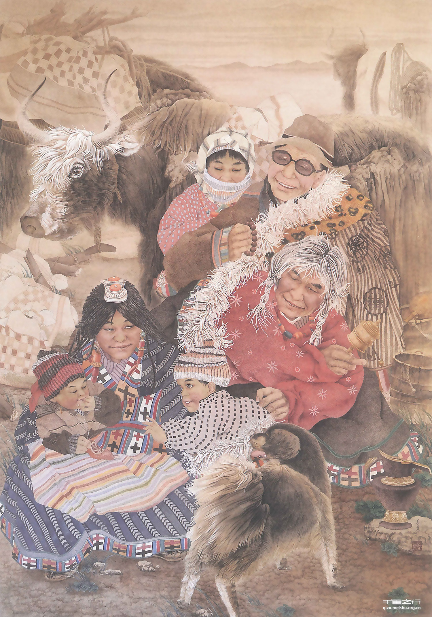 这是一幅以传统藏族普通家庭生活为题材的场景工笔画,内容丰富,人物形象生动,题材新颖,并具有浓厚的藏家生活气息,通过对人物形象和宗教信仰的刻画,体现出藏家生活的勤劳、朴实以及对美好生活的向往。