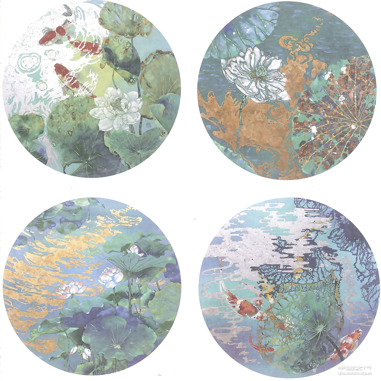 该生毕业创作《镜花水月》组画,利用了矿物色、金属箔将江南之夏表现得淋漓尽致,画面构图上非常饱满,装饰性较强,在色彩的应用上较为大胆且很富丽。