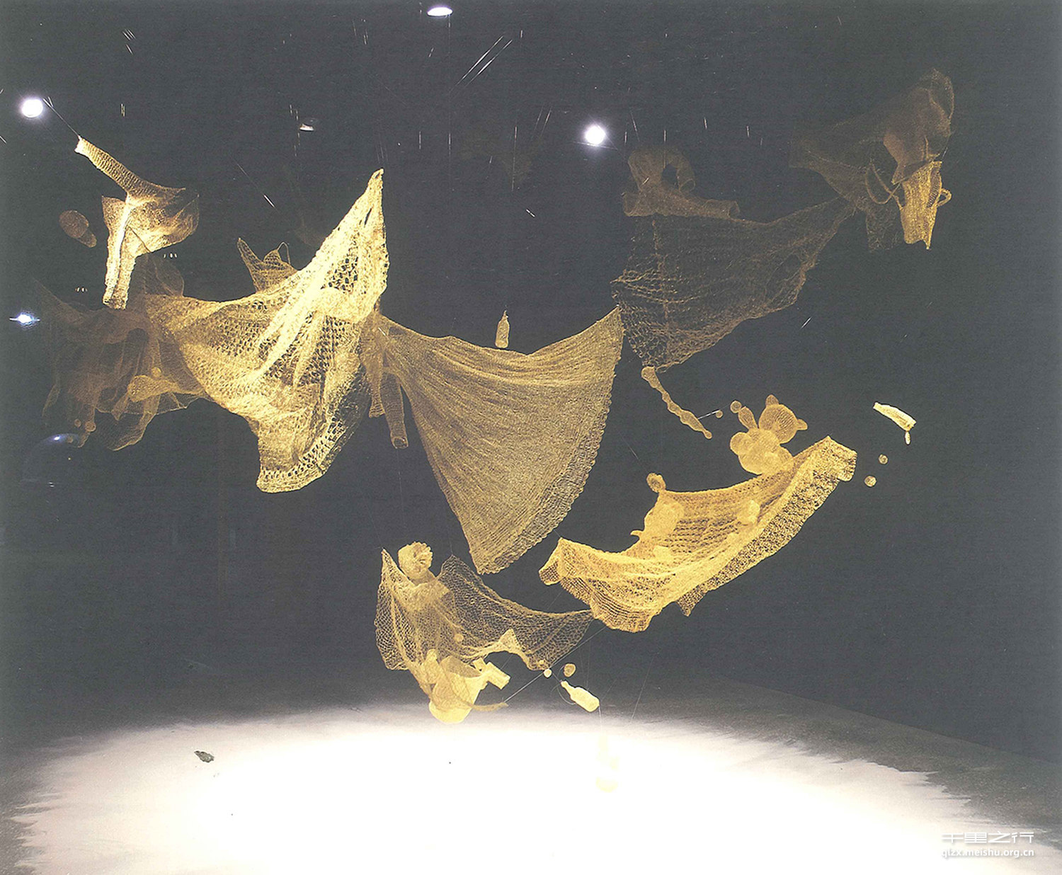 李隽开始编织的第一件作品,就是用细软的金属丝织成,可能是一条裤腿或是一块 围巾t看起来平淡无奇,但这种由金属丝线所编的织物,摸在手里有一种质朴但神秘的体验,犹如传说中的金丝甲。经过较长时间的摸索实践,李隽的金属丝制品在形态上变得更自由起来,其编织的纹理结构也更富于变化,作品面貌逐渐成熟。此次毕业展的作品名为《你好,忧愁》,是由多件女性衣物、鞋帽、玩具和日用品组成。这些在灯光衍射下的手工金属制品,于幽黑的背景中熠熠生光,其中略显凌乱的空间布局,又透露出女性意识中的一丝慵懒与随性。在这届毕业生作品展中,李隽在材料的使用上可以用惊艳来形容,这位清秀聪慧的女生,用她独特的编织方式,记录了她在美院学习过程中的生活轨迹,也承载了她对于雕塑、对于材料的感悟。悦目的霓裳、剔透的玩偶,除了奢华,还有一丝难以觉察的忧伤。