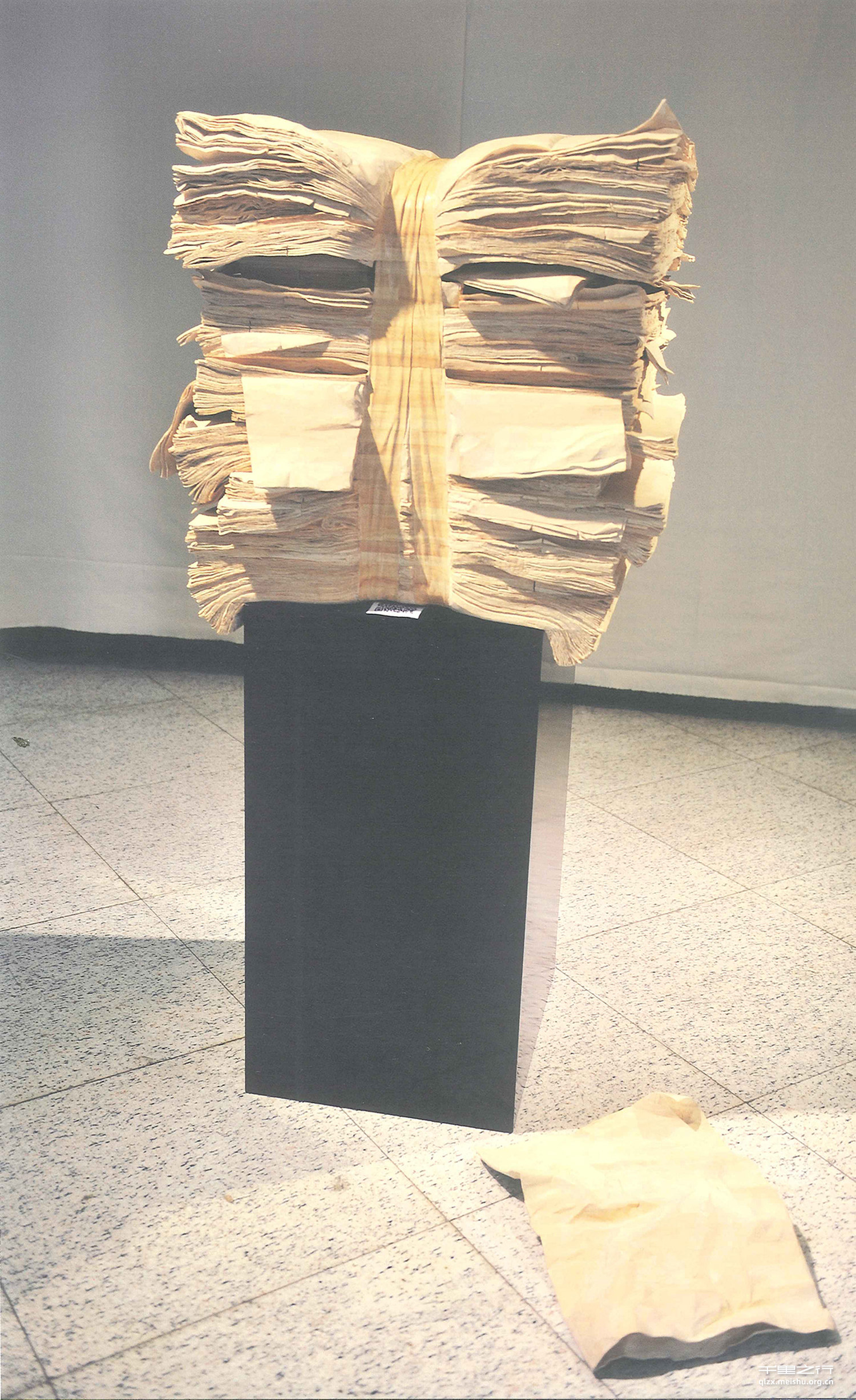 报纸是我们生活当中随处可见的东西,然而它的使命却极其短暂。在信息化飞速发展的时代, 人们对于信息的传播与获取都普遍来自于互联网。而对于像报纸这样的传统媒体正在慢慢淡出人们的视线,报纸在我们生活当中的角色被不断地削弱,变成我们的某一种回忆与情3§。木给人以质朴的感觉,而且又是制造纸的原材料,作品中是把一叠陈旧的、满是皱褶的带有历史感的报纸累起一落,以胶带打包的方式来描绘一种回忆、情感、生活。