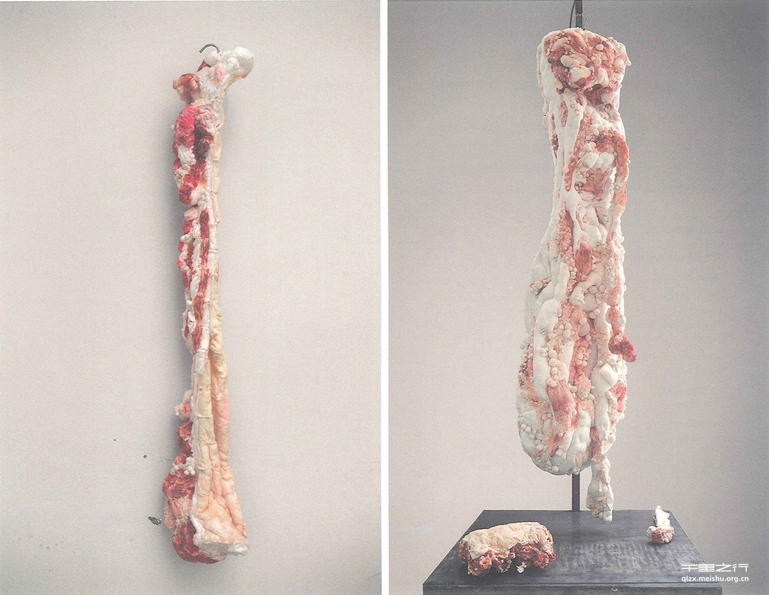 卸妆棉几乎是每个女性每天都会使用到的,经过身体的加工,织物的质感,颜色、气味发生 了触感的变化,这种带有女性身体痕迹的触感让我感受到这些充满脂肪意味的,同时擦除了表象又不参与内在构建的棉织物,和市场上“无主”的肉块有着同构的诗意。缝制的肉块在质感上是联想的,像是案板上熟知的肉块,而实际的体量则达到了难以驾驭的地步,这种微妙的矛盾结合肉块造型上不知是何生物何部位的组织这一点,试图达到一种戏剧化的张力,一种女性原始的能量释放。赛金花可以理解为清末社交救国名媛,也可以理解为一只猪。