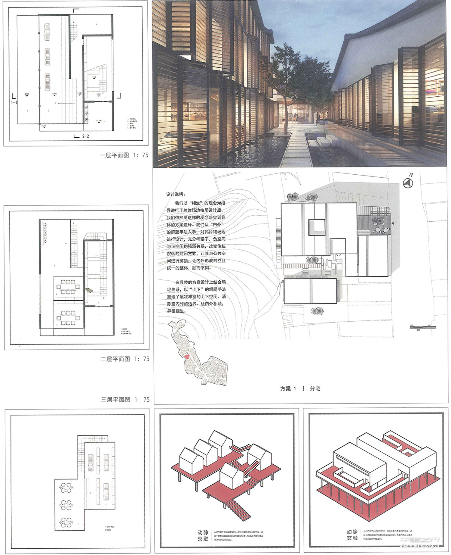 一个城市设计的命题,从场地、建筑的“负空间”入手切入设计,结合了大量的前期调研与 城市形态学的基础分析,提出了“异相”这一关键词来归纳丰富场地与建筑空间现象,并采用了建筑类型学的分类,提出了空间设计的5种基本模式,使不同属性的空间产生“相生”。在相生的设计概念衍生下,从内外、上下的空间概念出发做了书屋和分宅的具体建筑设计。整个展示摒弃了常规的现状-分析-概念-形式的套图方式,釆用了千净简单的视觉呈现手段,互动的贴纸设计有效地引发设计者与观众的互动。模型纯粹而直接地表达了设计小组的整体概念。