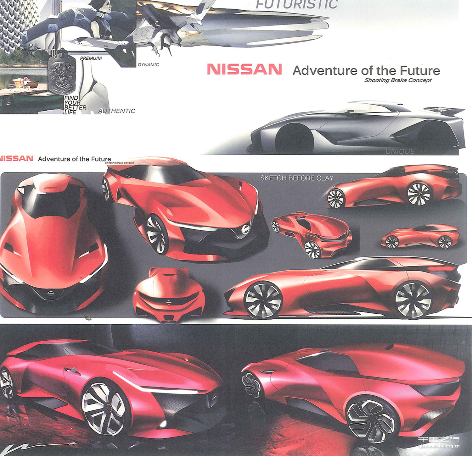 通常,猎装车是最受汽车设计师青睐的车型:设计领域的最新趋势会借助猎装 车设计得到充分体现。蒋松霖的曰产未来探险猎装概念车(NISSAN Adventureof the Future Shooting Brake Concept)完成于曰产中国设计中心,以成熟的设计手段合理地阐释了日产汽车的未来设计语言和设计方向。更重要的是在创作过程中,完成该作品的系统设计思维、方法与流程,均展现了当下全球汽车设计发展的水准。