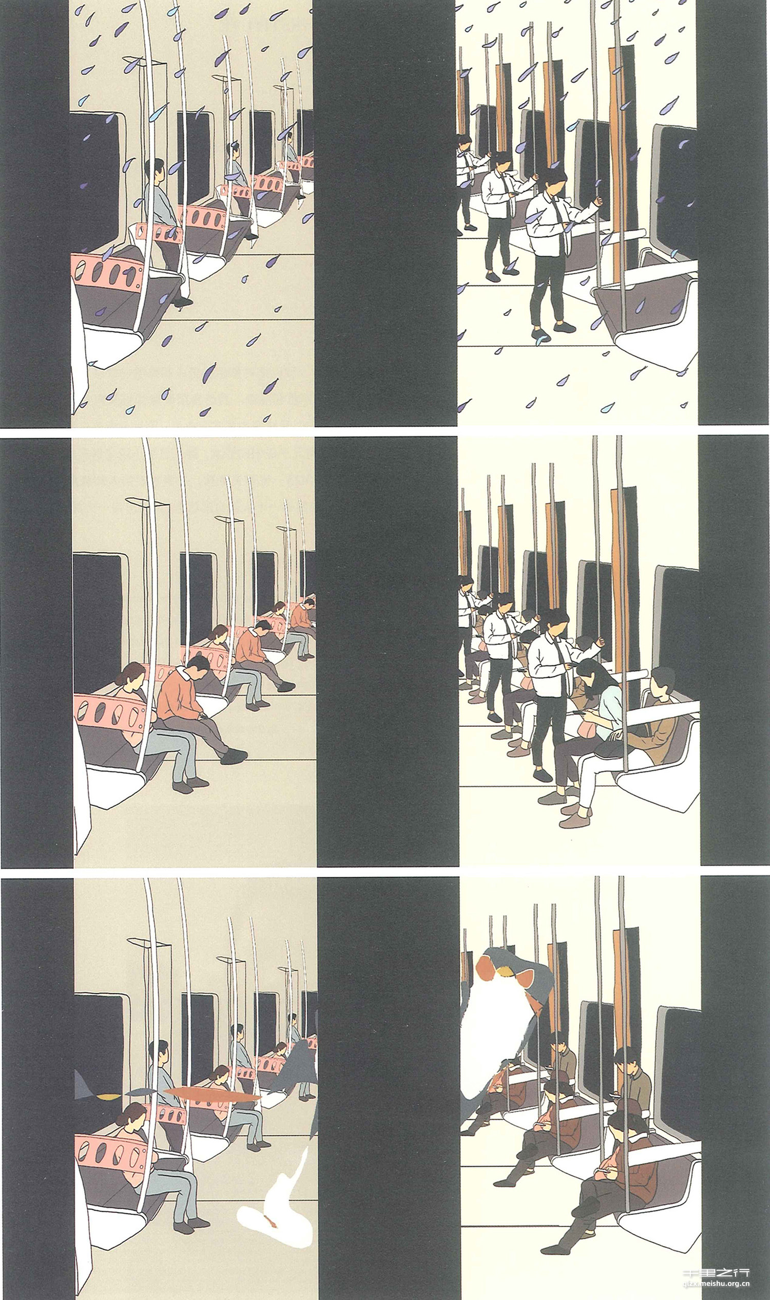 在地球上,我们常觉得自己是单独的个体,面对其他的个体时有一部分是你认为无法触及的。 我们将地铁视作这个世界的浓缩,你可以在里面看到各个职业的人,形形色色,来往匆匆!并且地铁是现代的交通工具,作为时间的伏笔,反射现实生活的现象。采用双屏的形式,营造两个独立的空间,暗喻两种不会接触到的人。很多时候,其实你和对方是有一定的内在联系的。用不规则的图形和线条,将两个画面联系在一起。来概况世界总体是相互联系的。