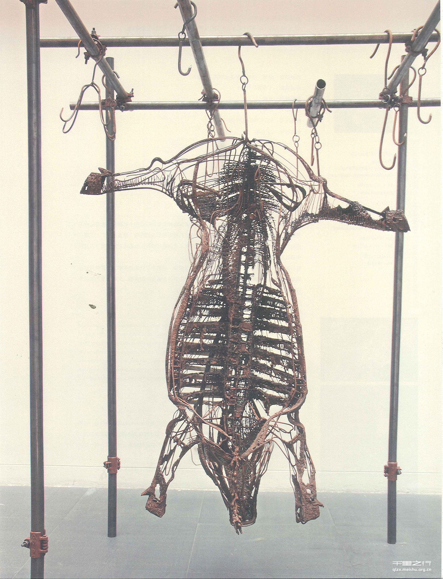 我的毕业创作源于我的生活经历。我从小就接触屠宰的场景,屠宰对于我而言是一种生存技能, 一些以前屠宰细节的记忆已经模煳了,但屠宰时候的那种氛围和场景仍在脑海里。促使我选择这一个题材进行创作是由于被屠宰分解之后猪的身体,那种肉和骨头线条的对比,m和面的关系,颜色、质感和温度吸引了我,我选择的材料是铁丝和金属,通过焊接的方式进行创作。铁丝是一种线性的表达,金属材料本身的特点就是冰冷,与有温度的猪肉本身就是一个强烈的对比。金属焊接可以运用焊点制作点和面,我想用画速写的方式,通过点线面关茅、,在三维空间里构建我的创作《屠宰》。