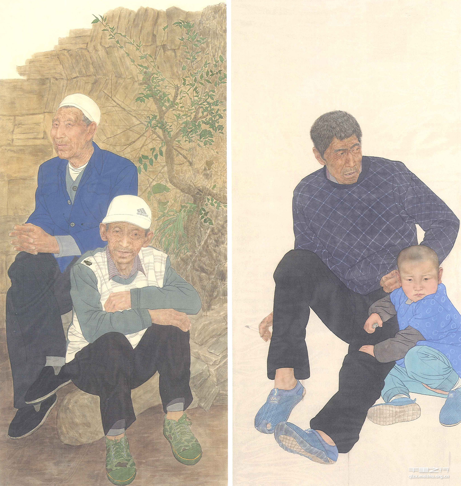 胡福星同学的创作《生机一守》《生机一盼》较好地体现了刘文西工作室的创作方向,熟 悉人物、造型、讲笔墨、求创新,两幅作品都属于肖像类创作,有一定的难度,人物动态看似随意摆放,实则是经过认真推敲的,人物形象刻画细致得体,老人形象运用大量山水画皴法,通过干皴、湿皴法,层层叠加,苍茫、厚润于形象,结合中国画的线法,较好地体现了工笔画的写意性。