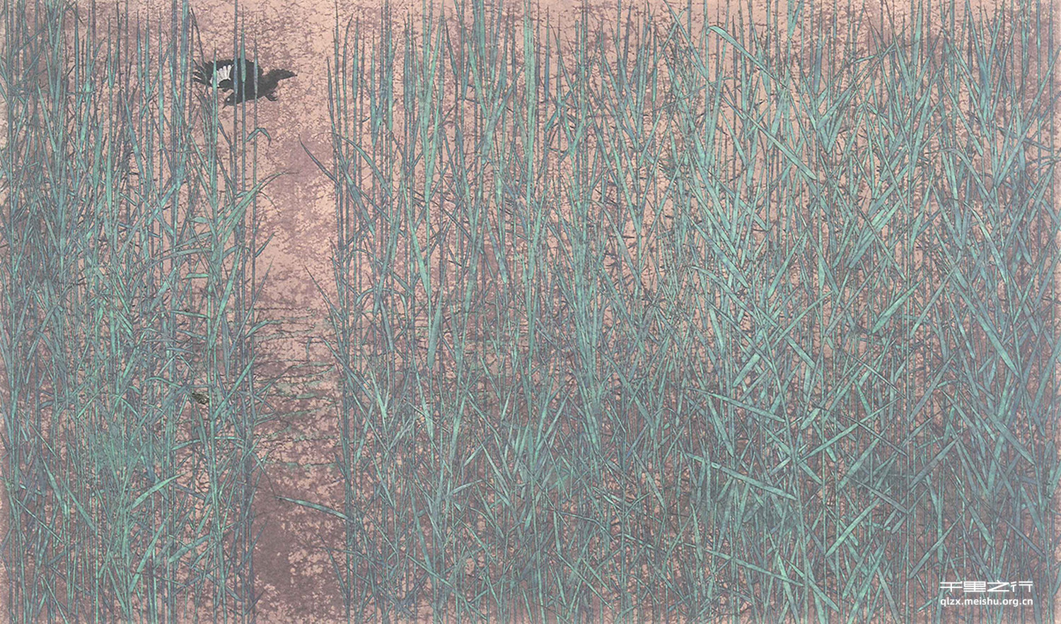 作品灵感来源于在西双版纳写生时看到的景色,借密集的芦苇来表达自然的生命力,芦苇生 长的形式感很强,中间的缝隙由莲叶穿插连接,在创作实践过程中,我将底色处理得比较有岁月感,画面中的色彩借鉴了中国传统壁画唐代墓室壁画中的颜色,使我深入了解了传统文化。画面营造祥和与宁静的主题,拓展臆想空间,注重意境二字在画面中的表达。