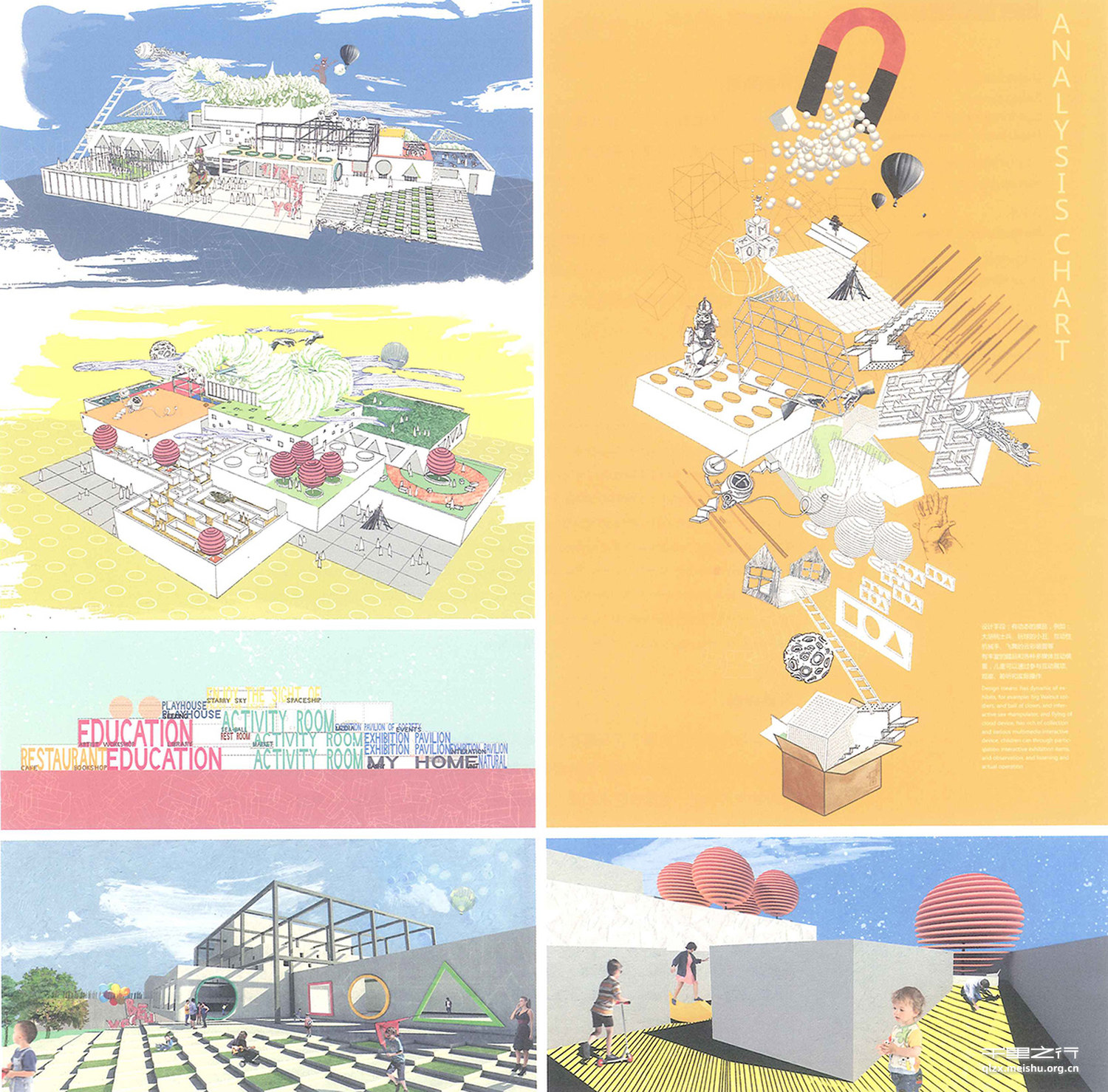 以体验设计导入完成的该作品,增添了场景的带入感,童趣盎然。空间界面塑造的丰富性, 激活了模块化的整体设计,生动有趣。图纸表现语言形式感强,表述简洁有效,色彩轻松明快。