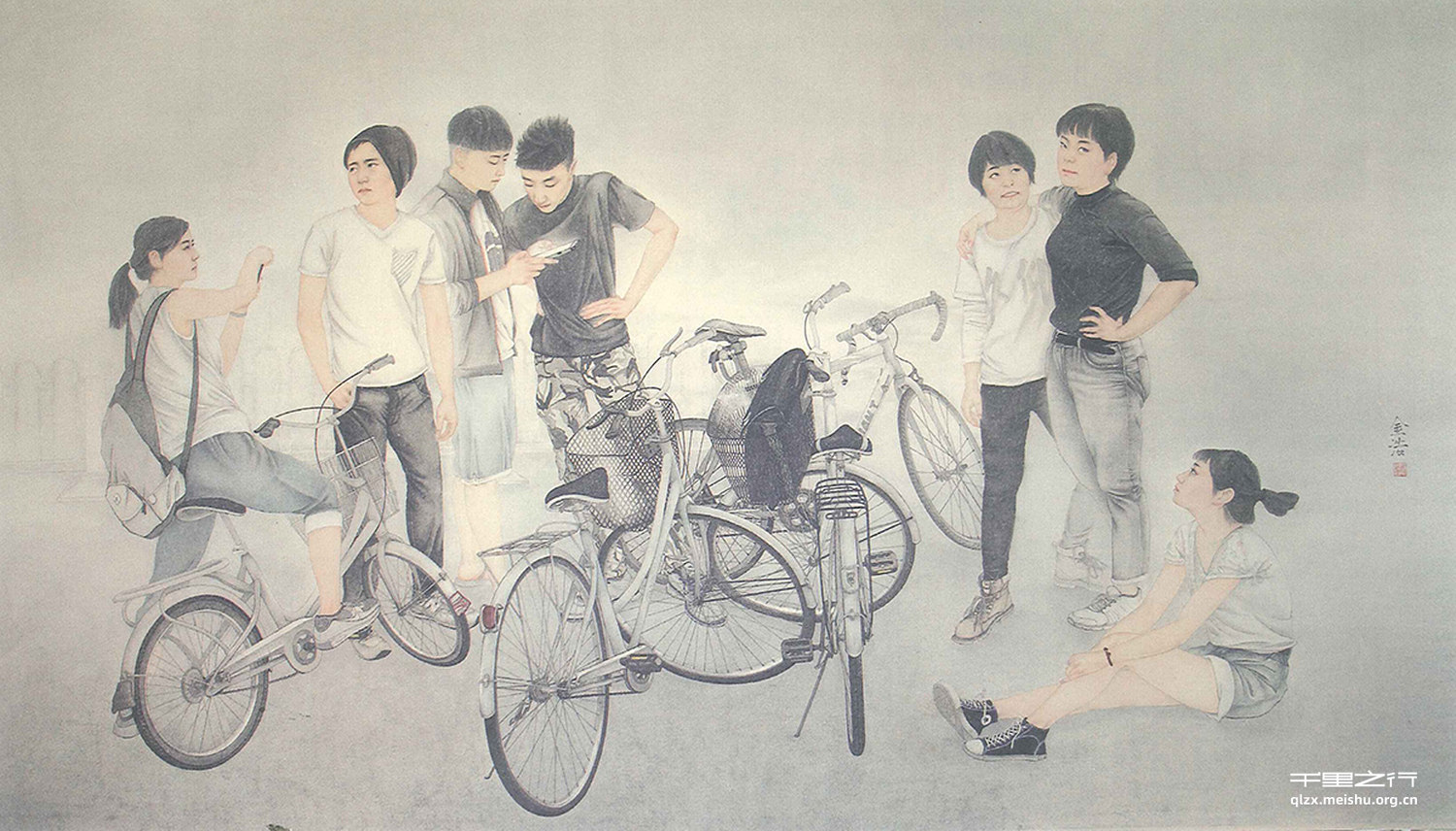 相对于古人来说,我们缺少了古人对于艺术追求的纯粹与虔诚,而是在嘈杂与快节奏的社会 环境下,寻找独特的形式创作博取人们的眼球。在现代工笔人物画中围绕青舂主题的创作更是屡见不鲜,面对这一题材,我起初是伴有困惑的,怕选题不够新颖,因为已经有很多这样题材的创作,我再画会不会略显“俗套”。都说“创作来源于生活,而高于生活”,从生活中发现美,进行艺术提炼是我所追求的。我的创作描绘的是同期同学,他们给予我最毫i观、最熟悉的感受。青春是给人以积极向上、朝气蓬勃感受的时期。此次创作,可看作是我的人生记录,以平和稳定的心态完成一幅较为单纯的工笔人物画创作。