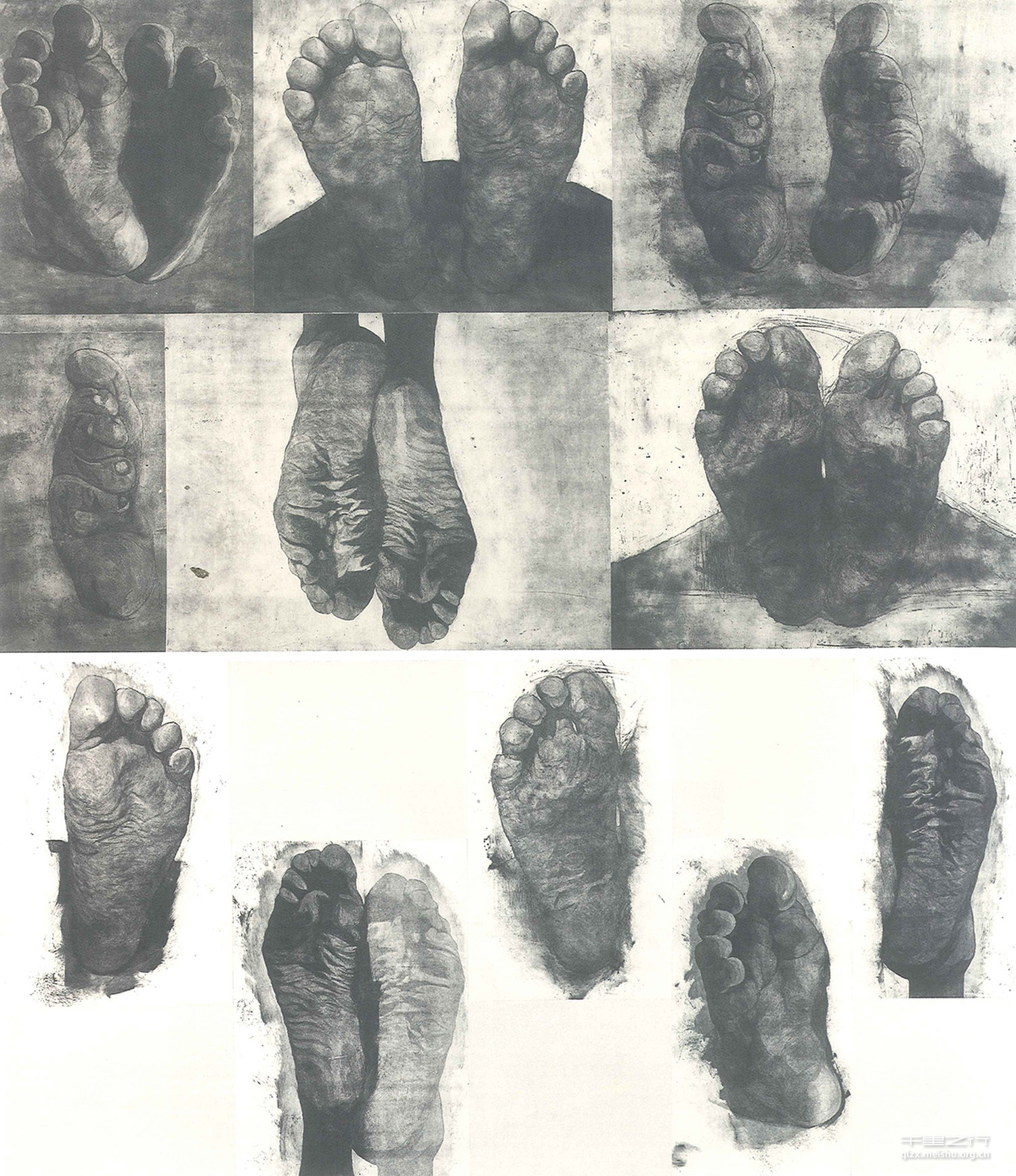 脚作为人身体的一部分,被赋予了多种含义,脚底和身体中的器官息息相关,我选择脚底板 作为我的创作题材是源于儿时观看外公做手术的场景,我总是蹲在手术室的角落里不敢出声,听着手术室中各种钳子、镊子在人身上碰撞发出来的声音,我很害怕,但总有那么一双脚对着我,病人的脚有的扭曲的狰狞着、有的一动不动就像死了一样。每个人不管是谁、是什么身份、什么职业,躺在手术室都是最脆弱的时候,但这并不只是反映一种做手术的状态,也将人的职业、生活环境、人的身体健康等一些“人”本身的信息联系起来。我通过用铜版线刻、飞尘、软蜡的技法,试图表现出不同的脚的不同质感。I