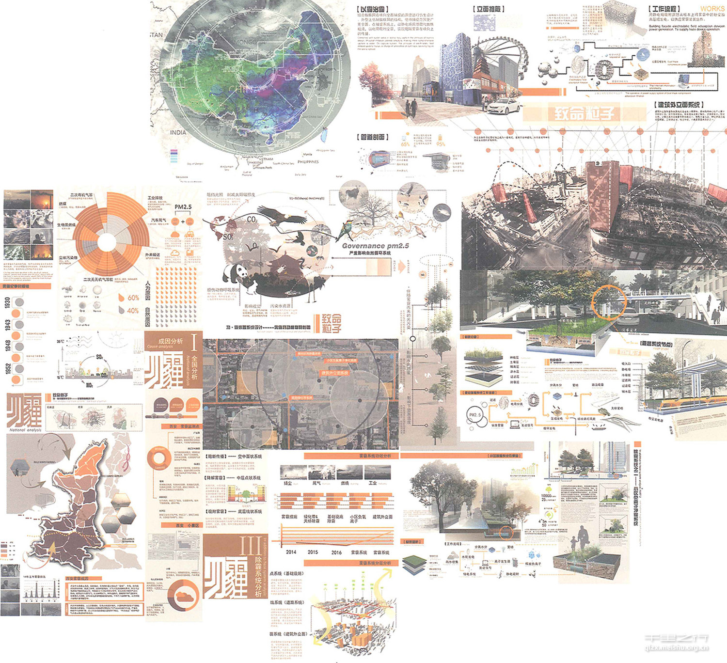 治理雾霾已经成为当今社会生活的一件重要事宜,本设计是以治理雾霾为命题而 展开的,通过进行选点并进行了深入的系统知识学习、整理后,形成了空域、中域、地域的上、中、下三个空间领域的系统性治®措施,或者称之为控制、防御系统。该组同学努力勤奋,勇于探索,极具团队合作精神,还具备较好的图形表达与设计能力,这些都是该设计完成的良好基础。
