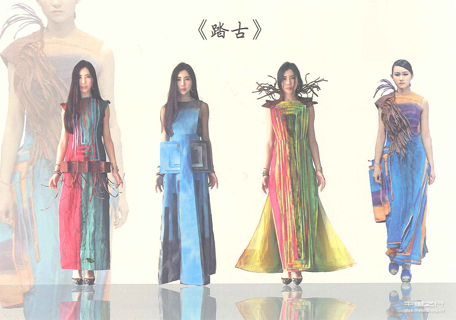 作品《踏古》不拘泥于传统的设计视角,将古韵流彩吸纳于人体的唿吸起伏之中, 又用高度概括的直线反复框制,将强烈的对比色置于不同面积之下,又形成单独对比。整体对比强烈,冲破人体基本框架,局部对比又使作品稳健,趋于大同。在结构上,破除传统中式结构构成,按当下服饰审美结构,但利用中式手法的直线,折角与人体结合,于平面中见立体,于立体中窥人体的转折流动。同时,用传统的染色抽褶工艺加大了作品表面色彩和结构的机理变化,丰富设计内涵。